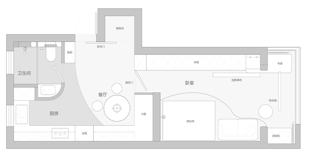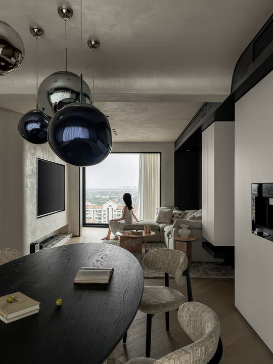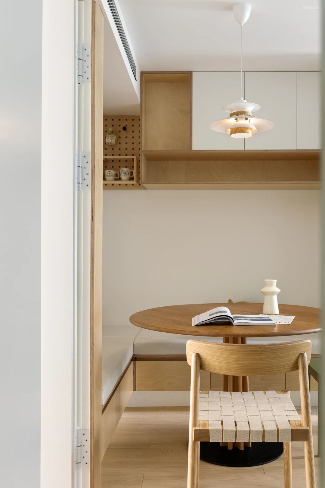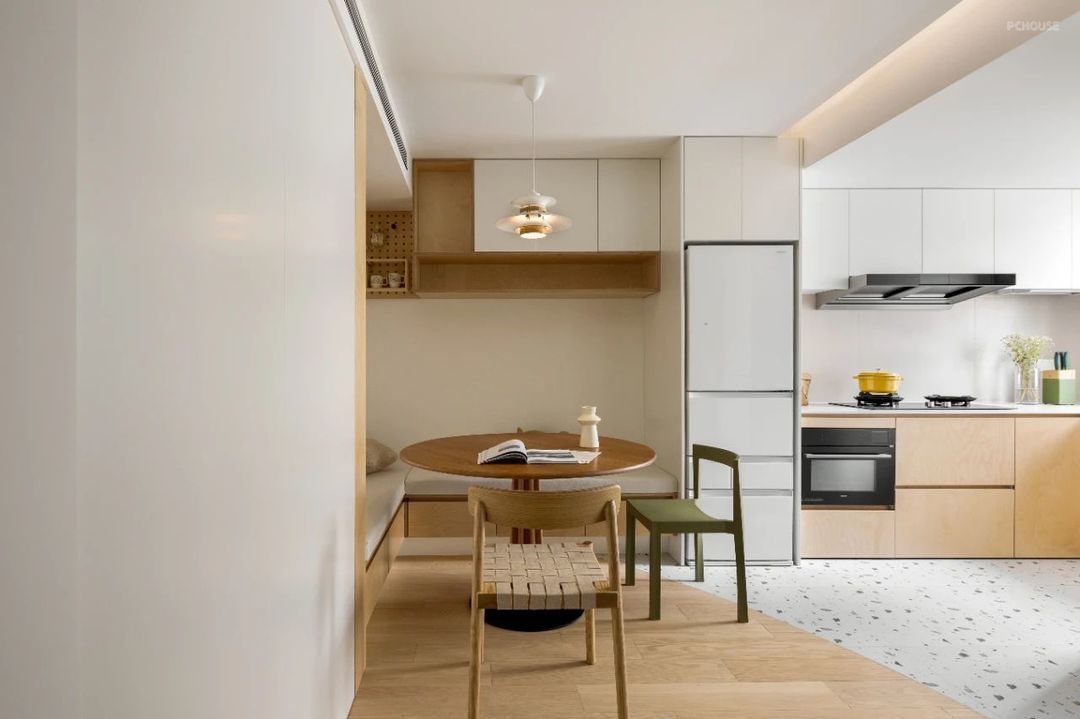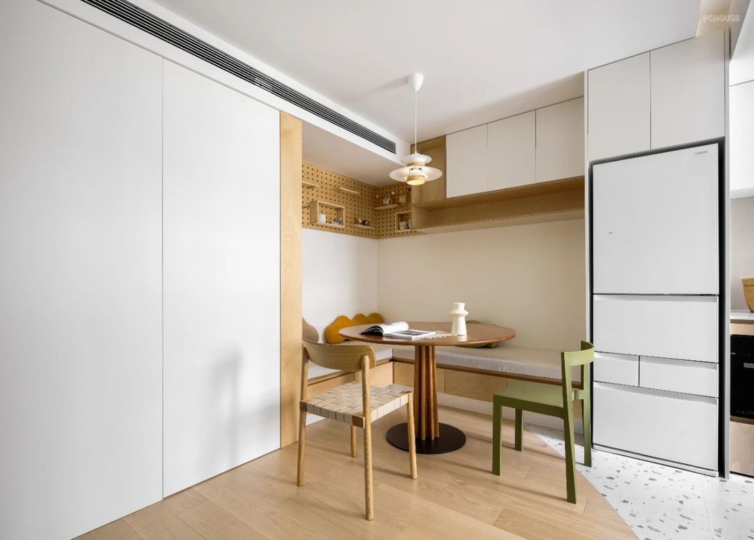 餐厅区域的设计别出心裁,卡座与圆桌的搭配,既实用又充满趣味。而圆桌的上方的吊灯,为用餐时光增添了一份浪漫与温馨。卡座下方隐藏着的收纳空间。