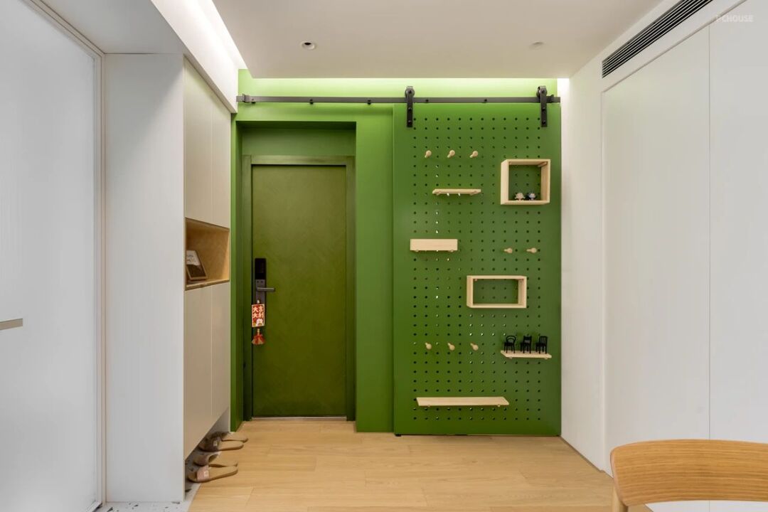 绿色洞洞板,不仅增添了一抹清新的色彩,更是创意收纳的小天地。钥匙、帽子、围巾,每一件日常小物都有了属于自己的位置。