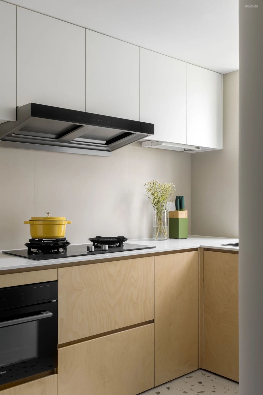 转身步入开放式厨房,L型厨房操作台流畅而宽敞,无论是准备食材还是烹饪美食,都能得心应手,弧形的墙面设计,让厨房显得更为柔和。