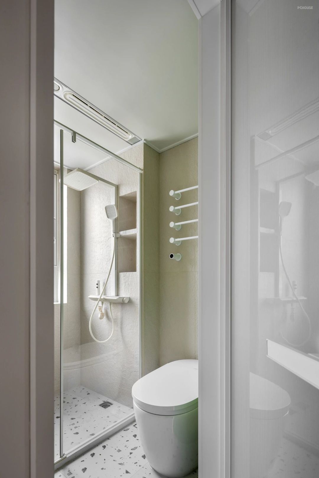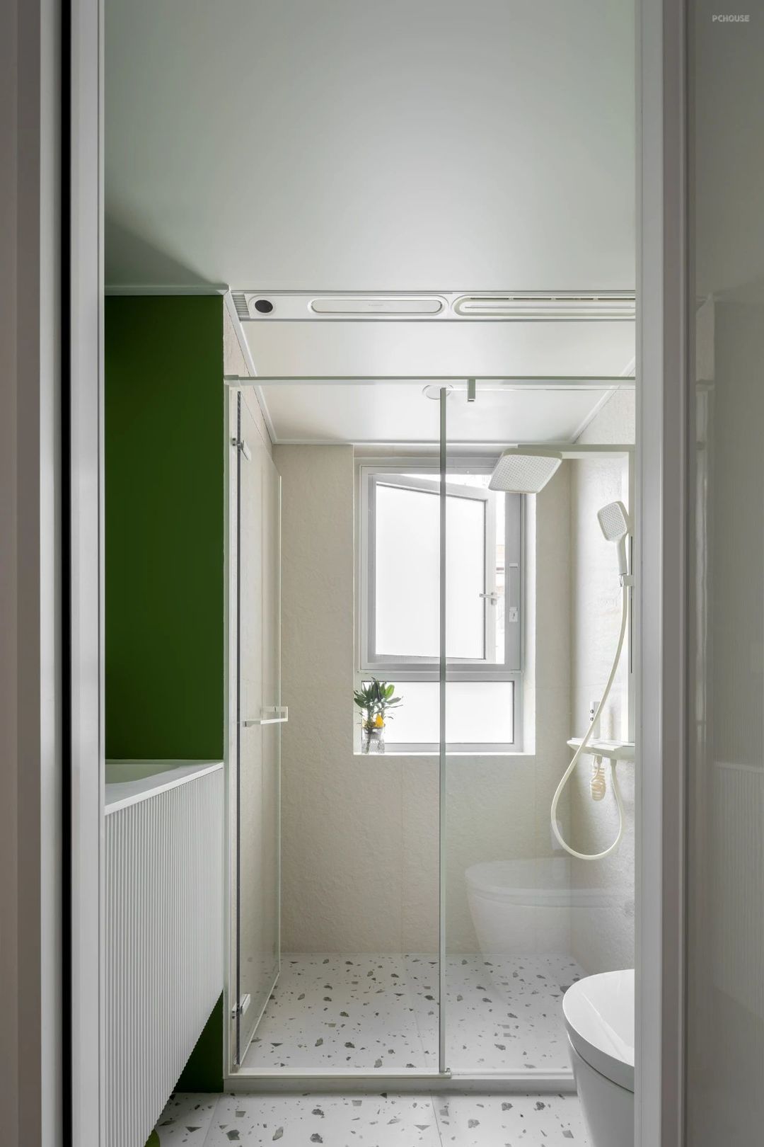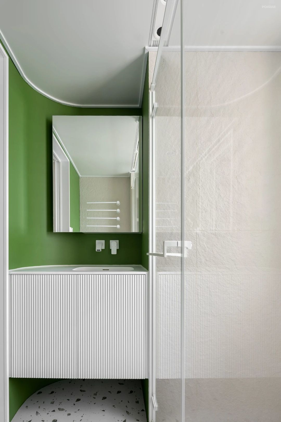 洗漱区用清新的绿色明亮而活跃,仿佛晨间的一缕阳光;干湿分离的设计,肌理砖带来高级的质感。