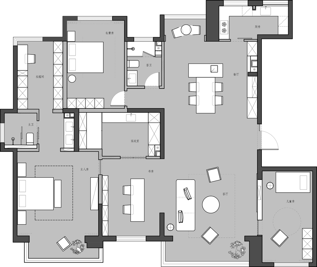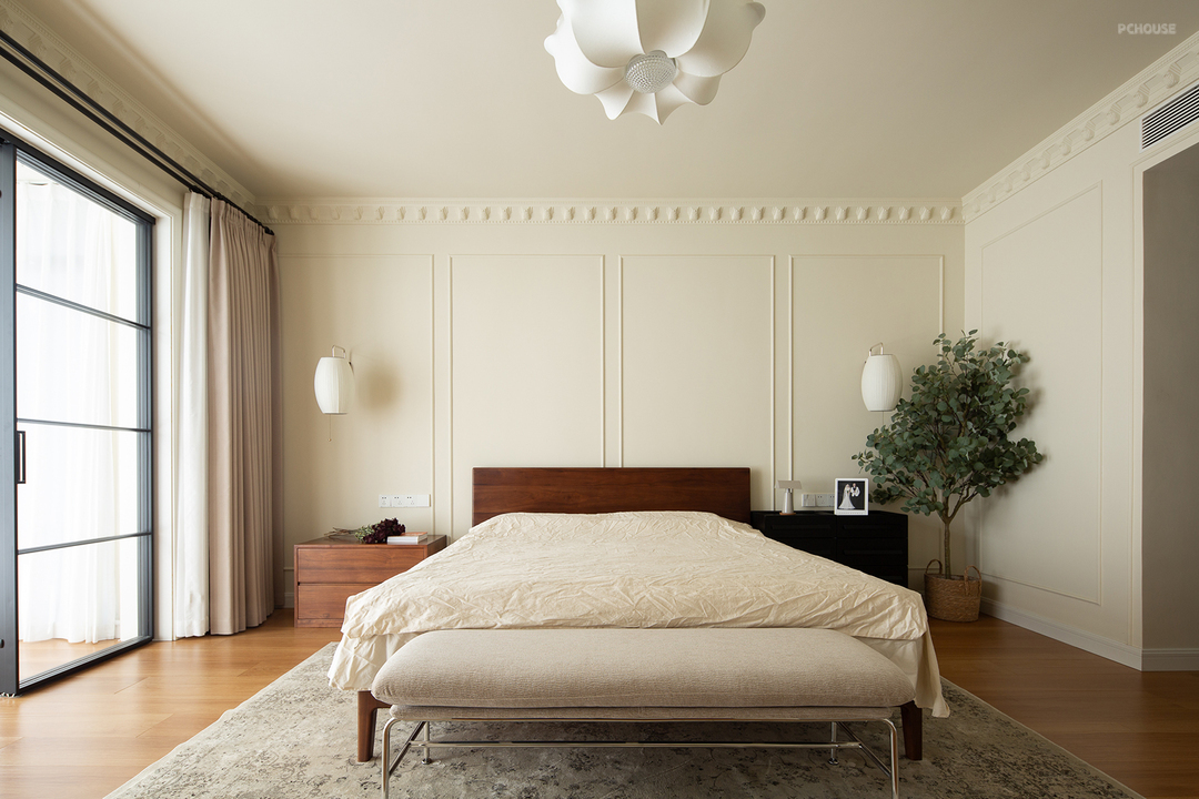 卧室内的空间充足,采用套房形式,赋予每一个生活环节独立的区域——梳妆、沐浴、更衣、休憩,各自拥有专属空间,同时又通过精妙的设计相互连接,构成一个独特的私密领域。