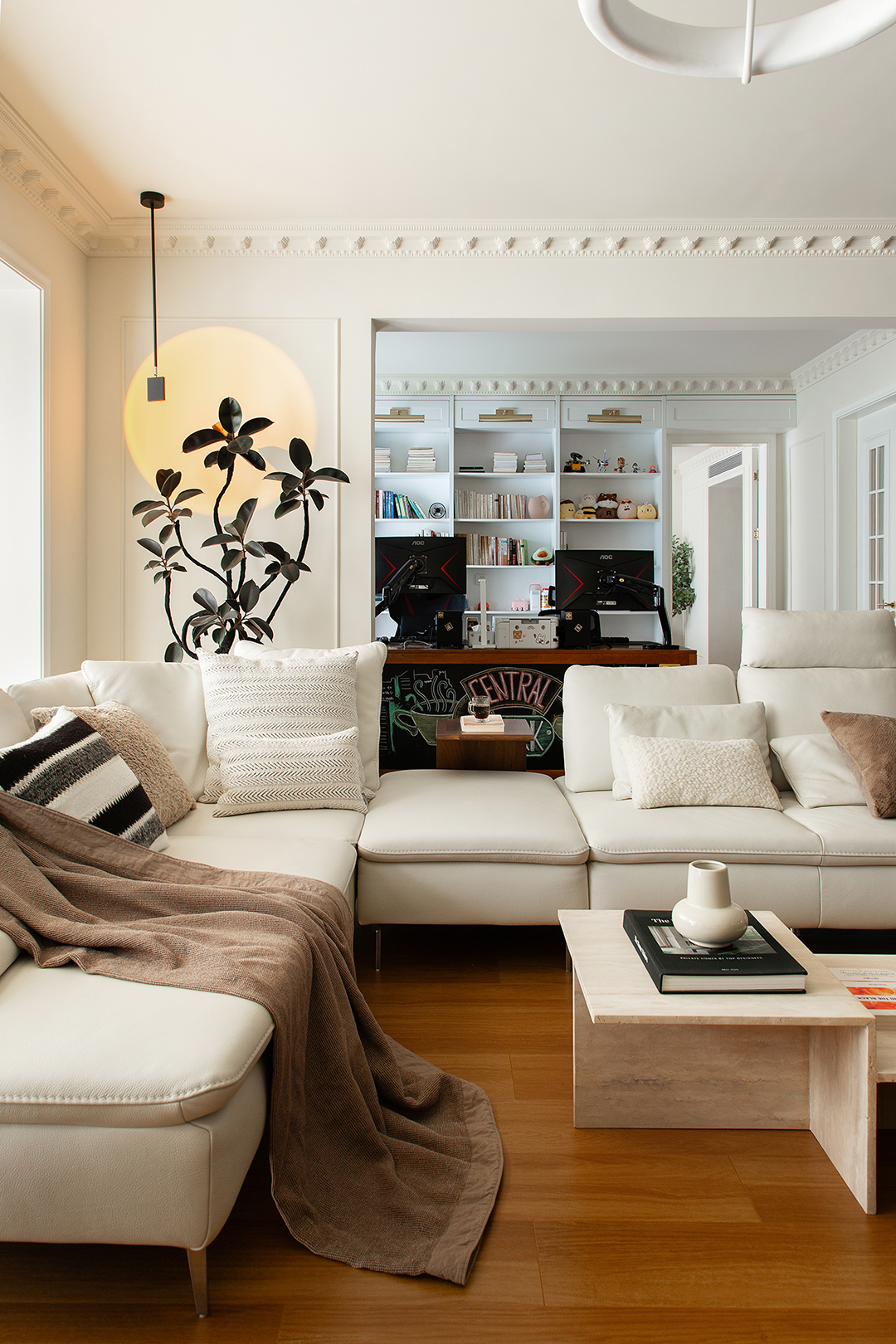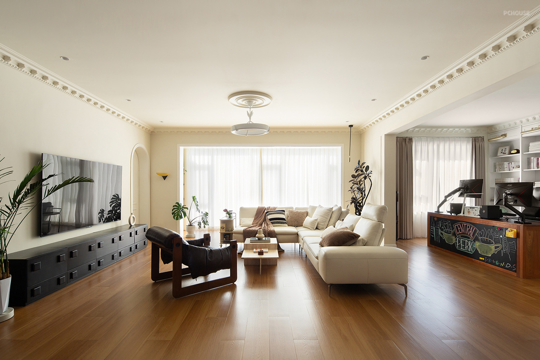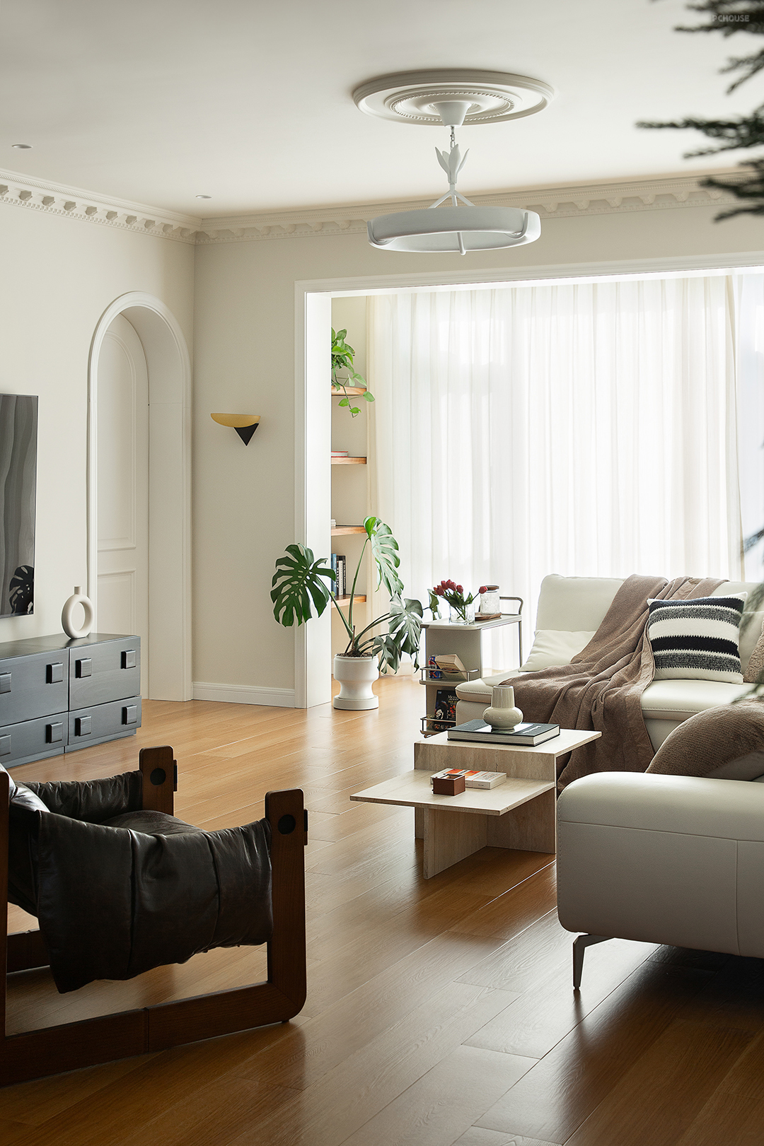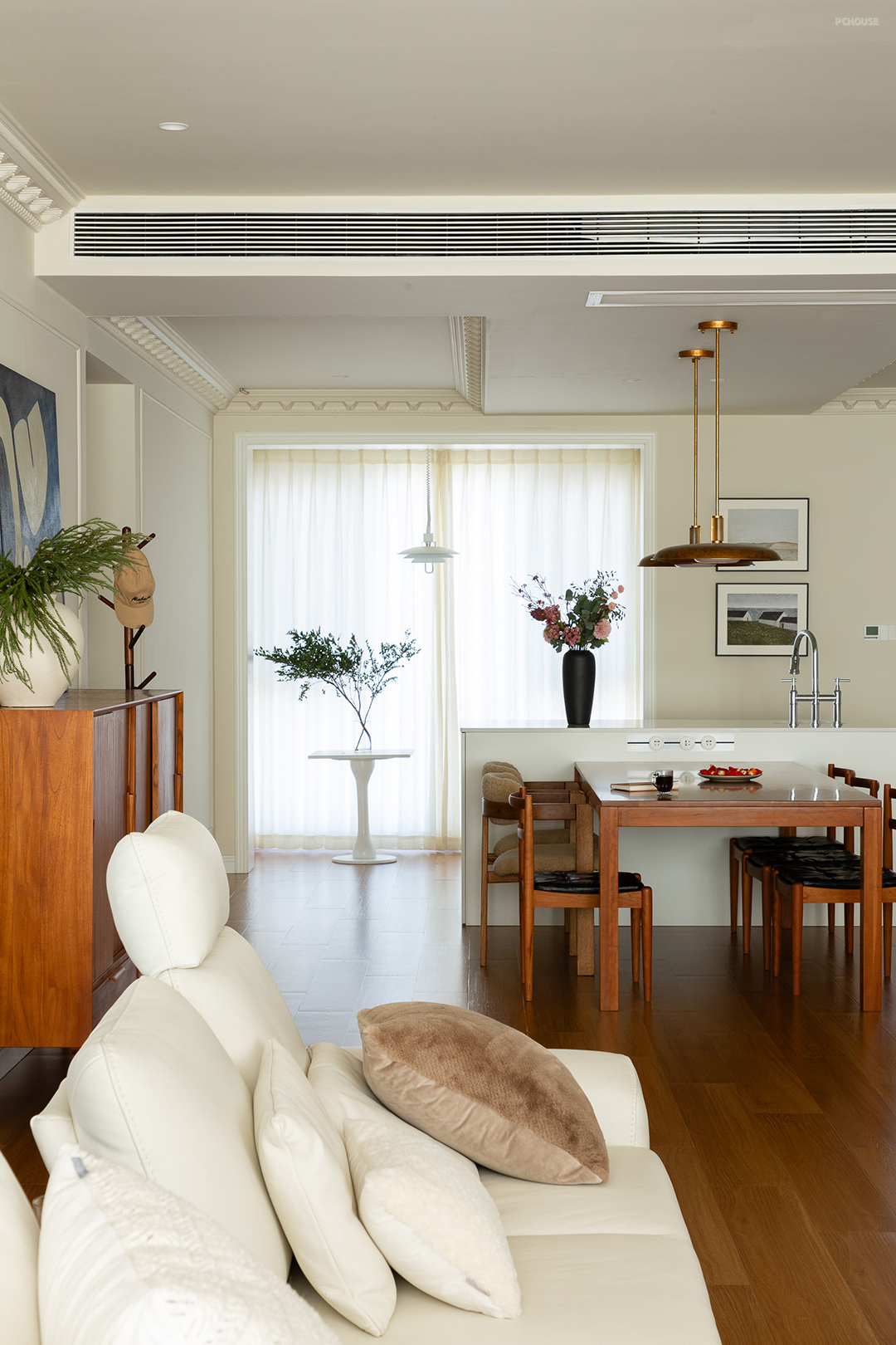白色与木色的基调,搭配柔和的线性灯光,轻柔地勾勒出空间的轮廓,让人一踏入其中便能感受到家的温暖与自由。这里,是思绪散发、灵感涌现的地方,也是与亲友共享时光的中心。