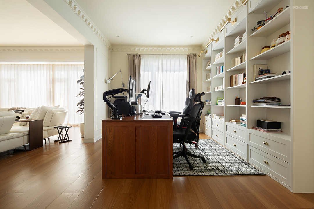 作为家庭中最重要的空间,电竞书房完美地融合了功能性与娱乐性。设计师摒弃了传统的封闭布局,将电竞书房巧妙地与客厅相连,使其在保持独立性的同时,也与整个空间进行互动。