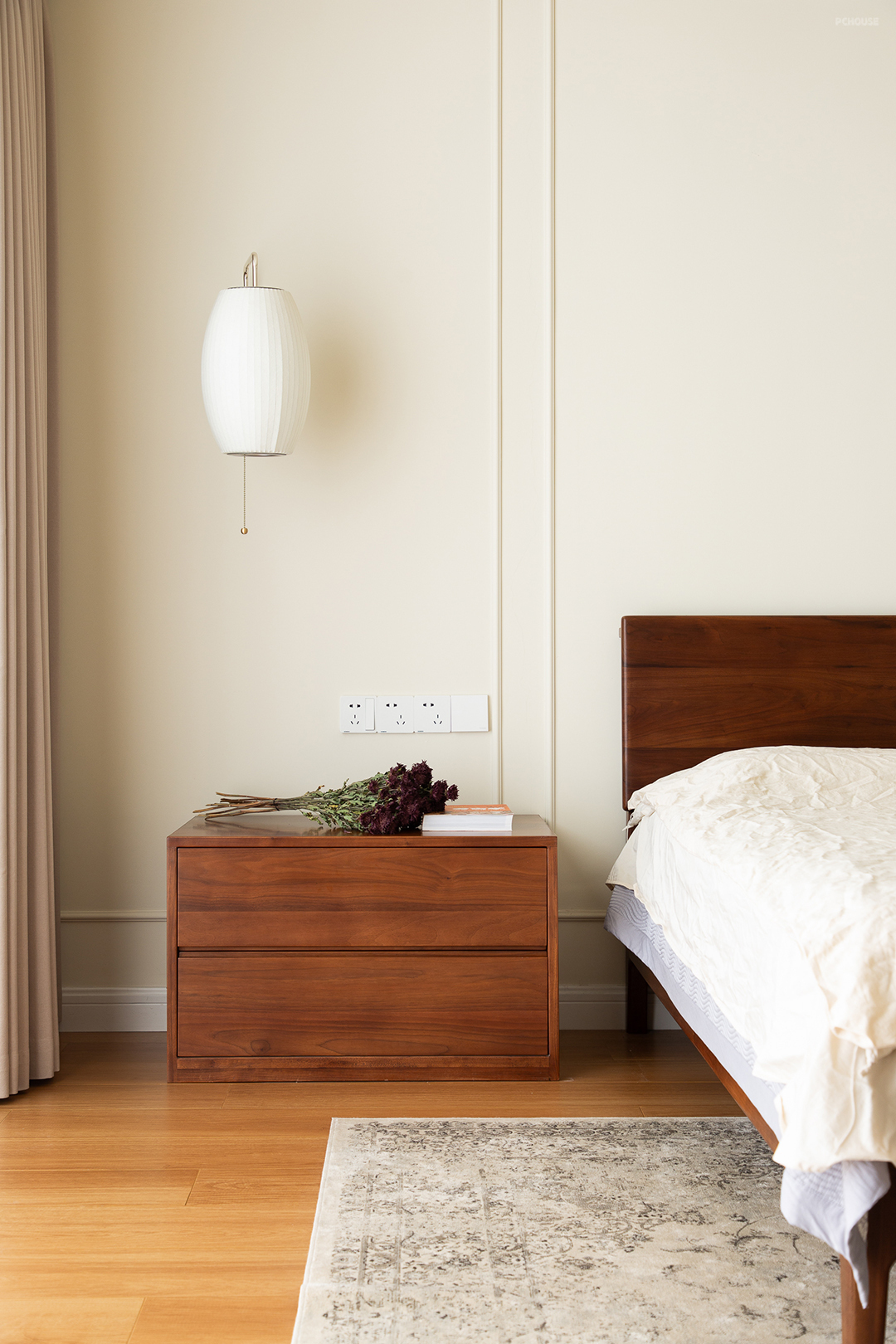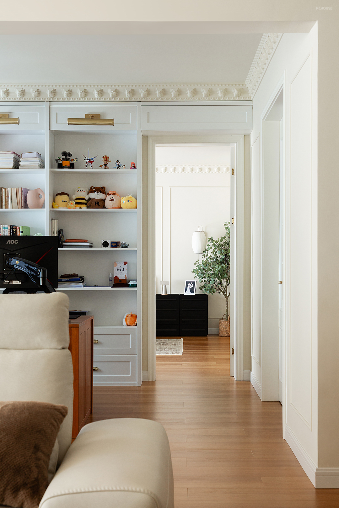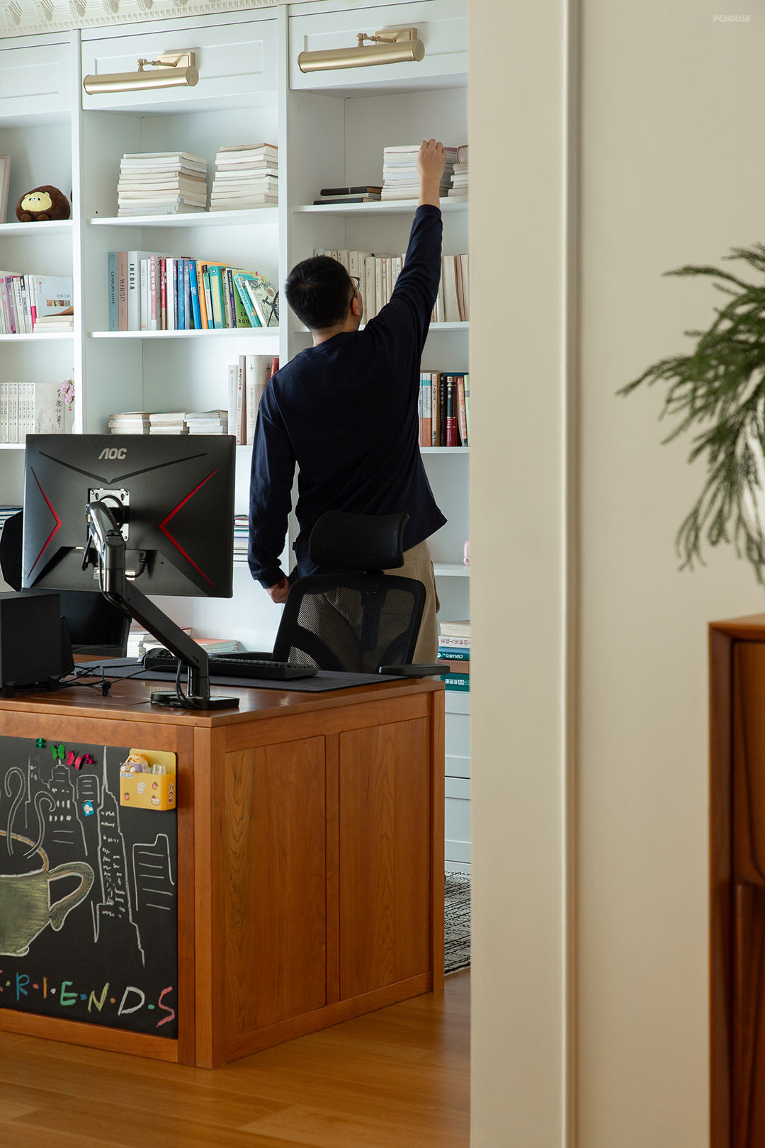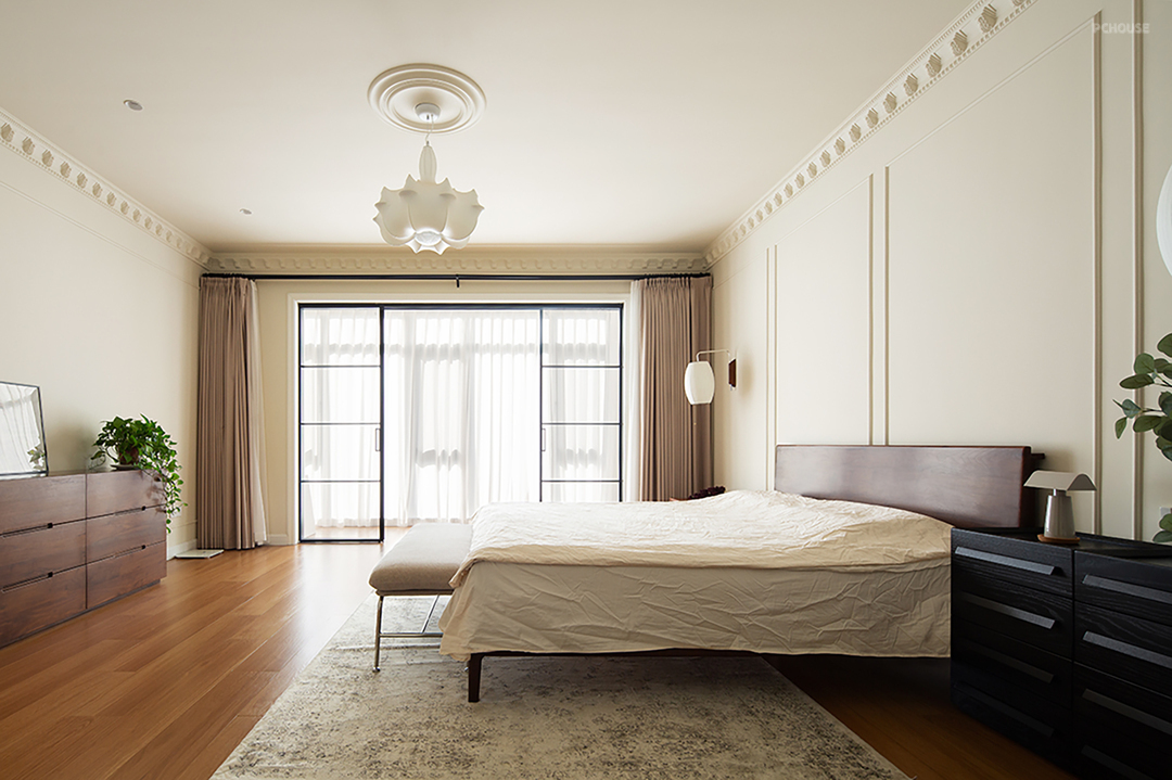 主卧室是一个需要“解密”的私人空间。它的入口巧妙地融入书房之中,形成一个独立的休憩区。