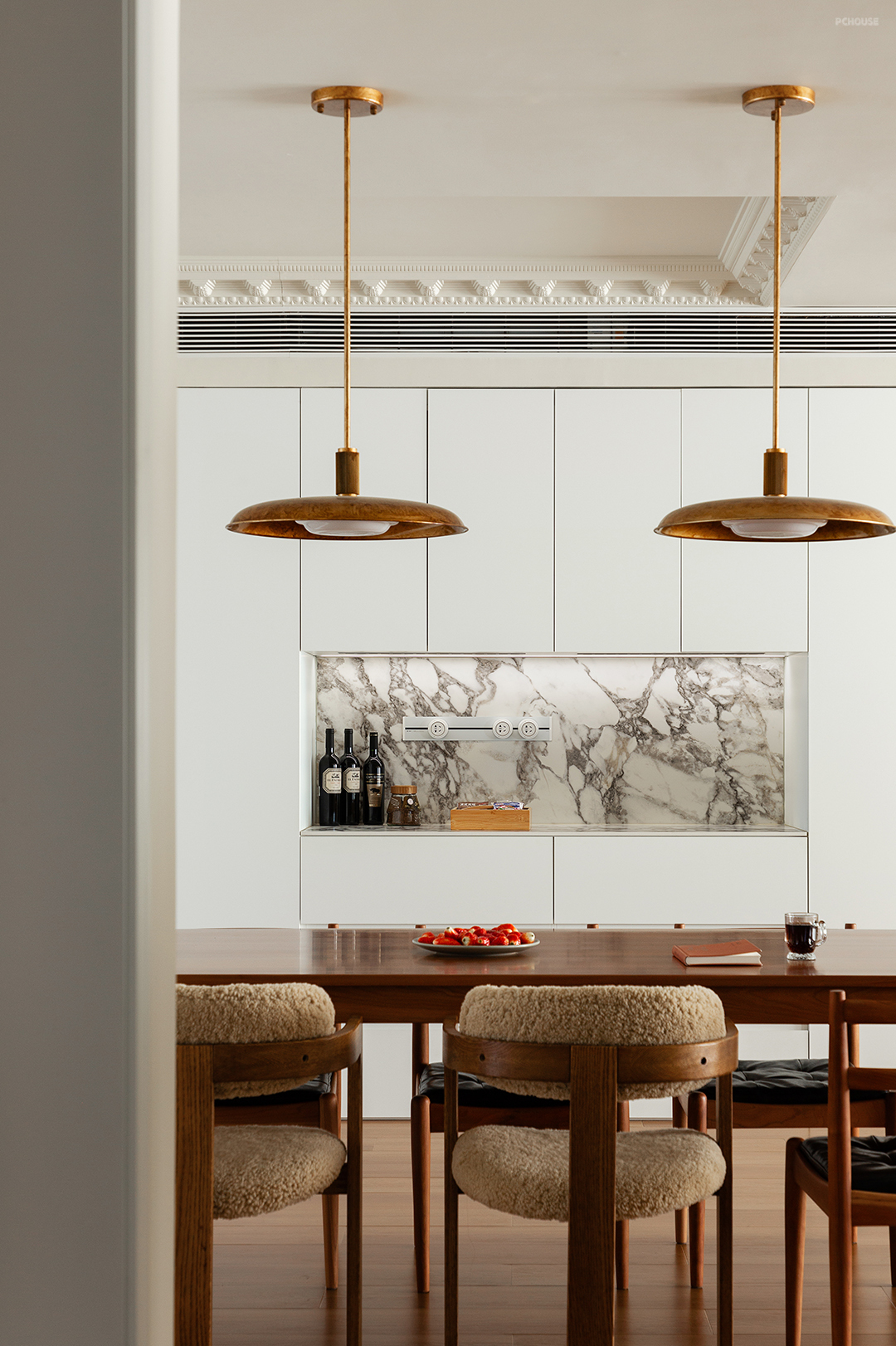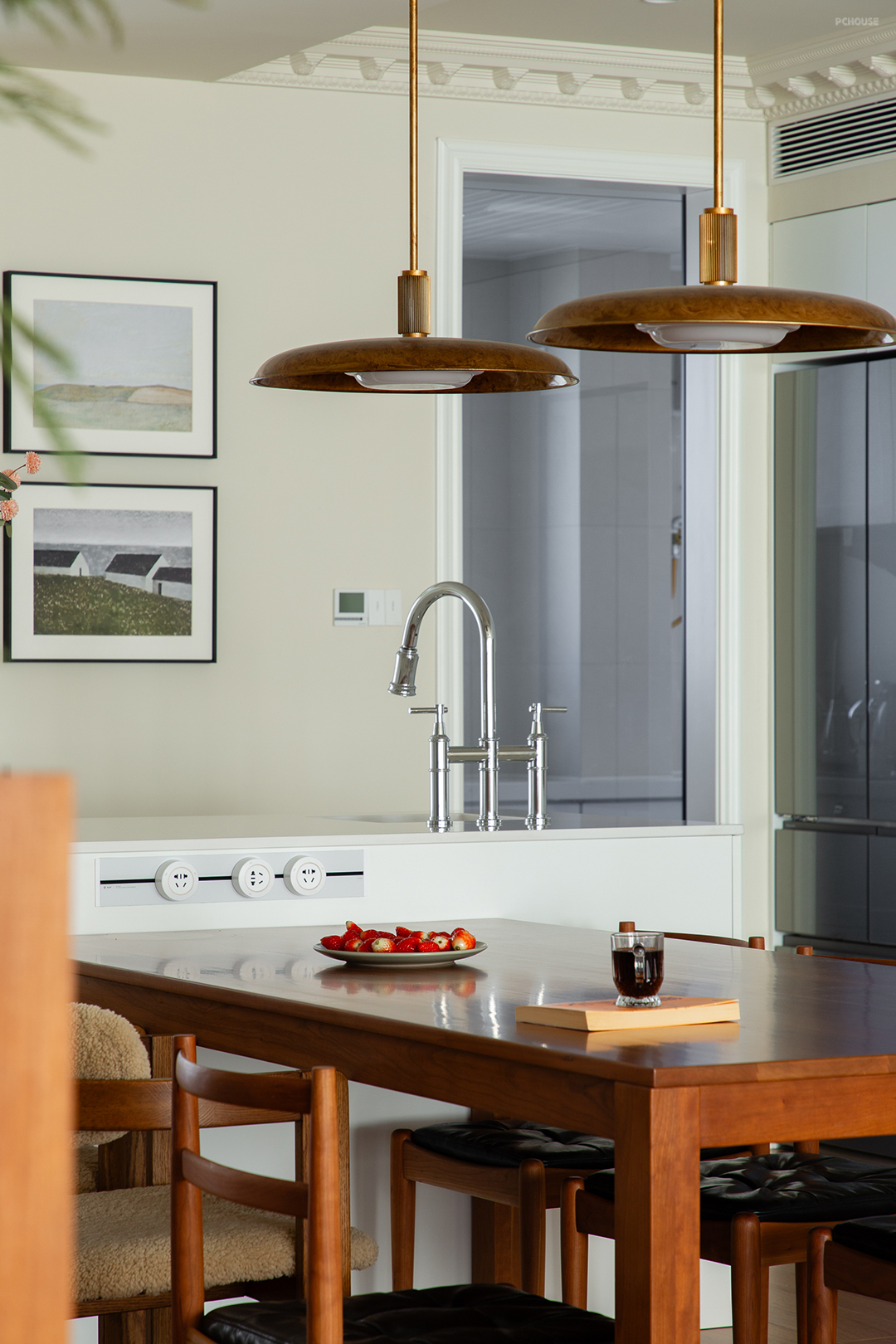 餐厅作为家庭生活的重要组成部分,它与厨房之间的无隔断设计,让空间更加通透与流动。餐桌与岛台的T型结构巧妙交织,不仅打破了传统餐厅的功能局限,也增强了空间的灵活性与互动性。这里没有传统的封闭空间,反而让每一次用餐都成为家人、朋友之间的交流与共享。