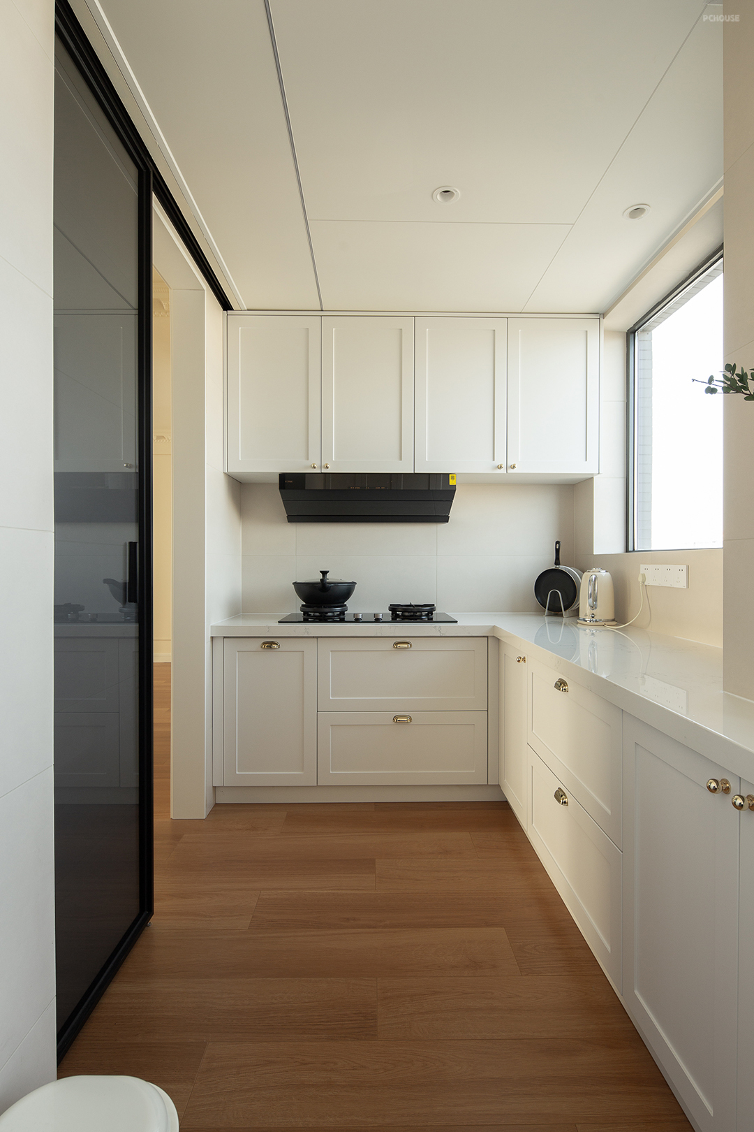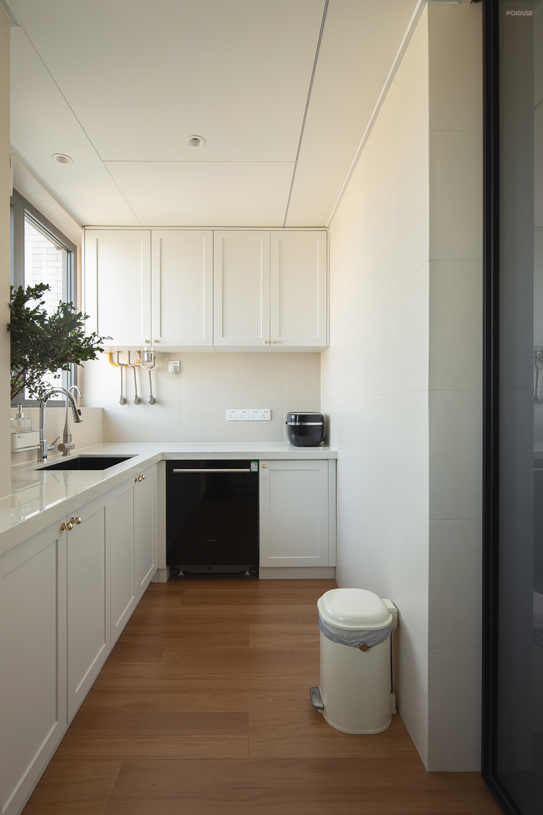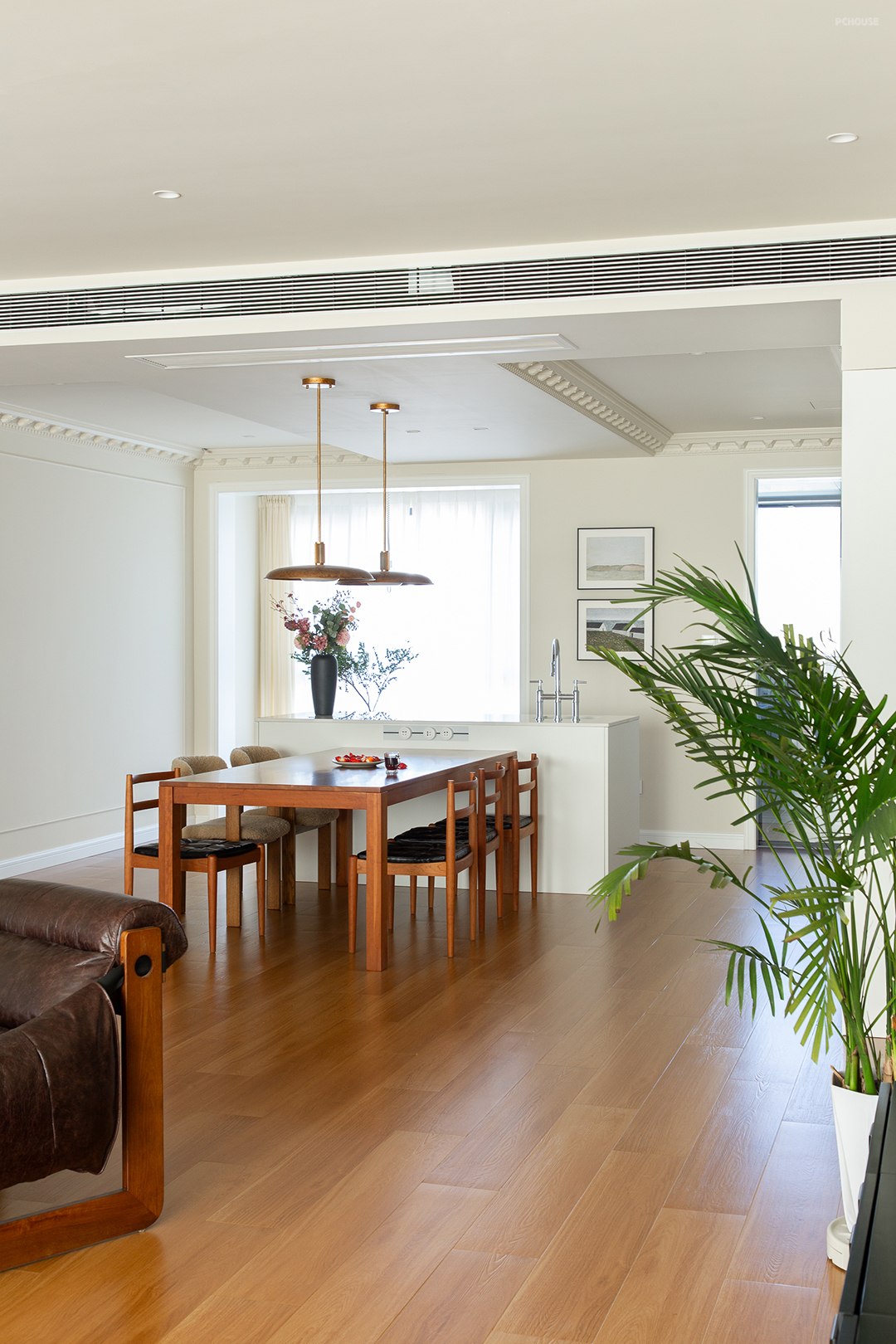 原本的厨房与餐厅有着明显的隔断,而在本案中,设计师大胆地打破了这种传统的布局,将厨房巧妙地隐藏在视觉之外。采用简洁的白色与木色搭配,使得厨房既保留了传统的实用性,又完美融入了整体空间的流动性。