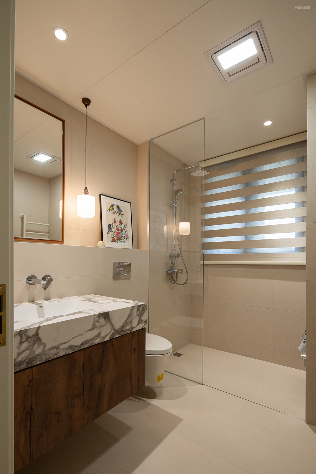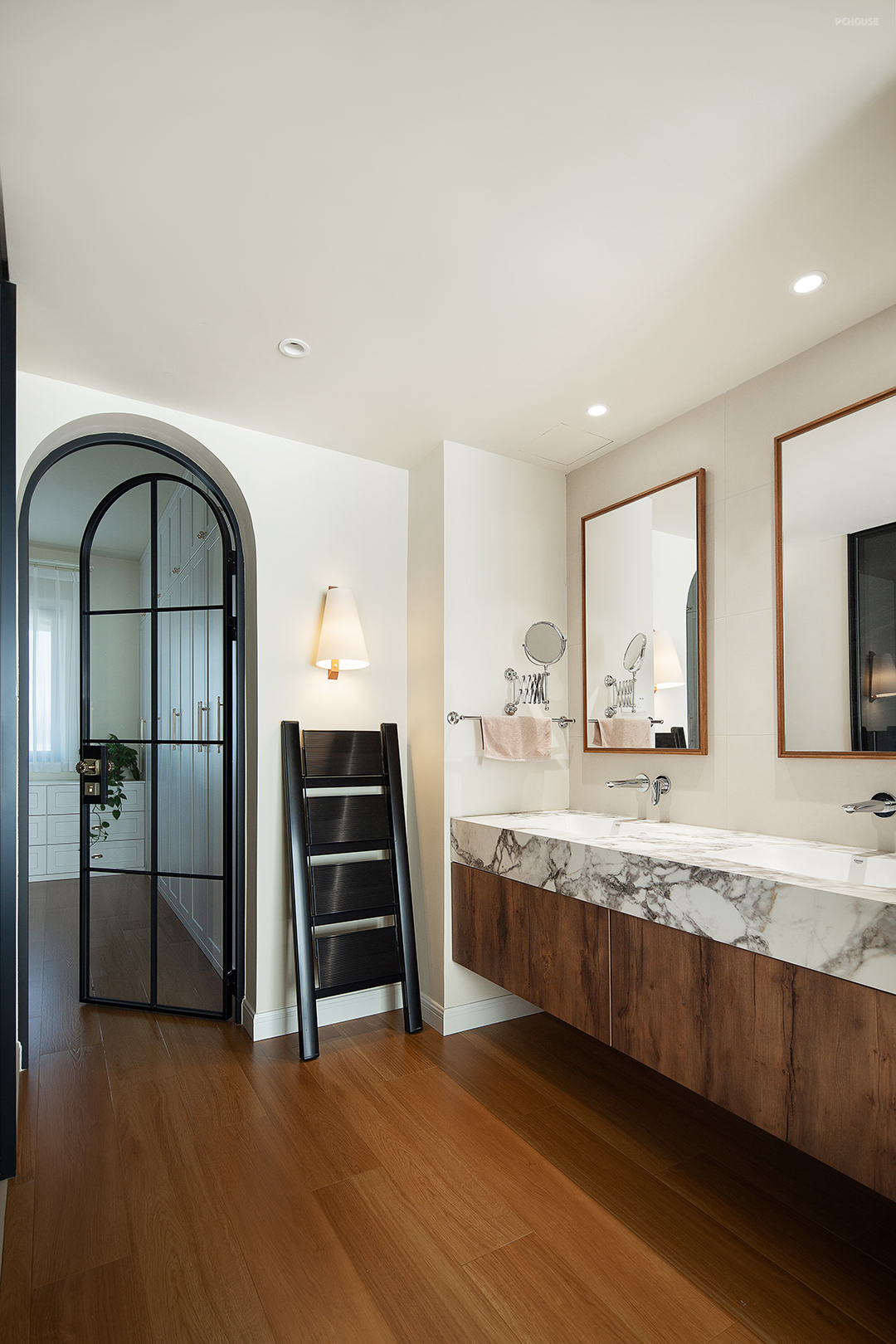 盥洗盆外置,墙面与洗手台齐平,玻璃包裹的设计让空间在视觉上保持通透感,巧妙的元素装饰为每个区域增添了独特的风情。每一个小细节都在诉说着对生活的尊重,空间的每一处设计都充满了仪式感,向生活致敬。