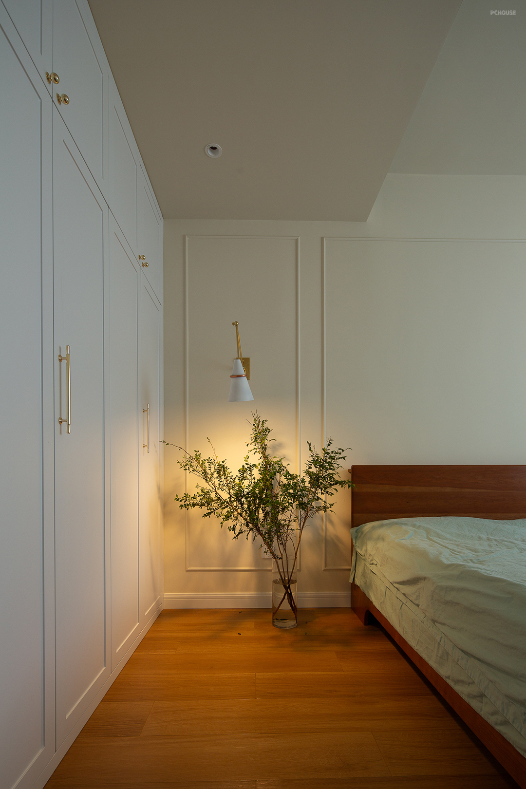 次卧的设计以简洁与宁静为主,营造出一个温馨、舒适的私密空间。白色的衣柜与金色把手相得益彰,展现出现代极简风格的优雅。墙面采用精致的线条装饰,增加了空间的层次感和艺术气息。床头的木质床架自然温暖,与整体简约风格完美契合,为房间增添了一份质感。