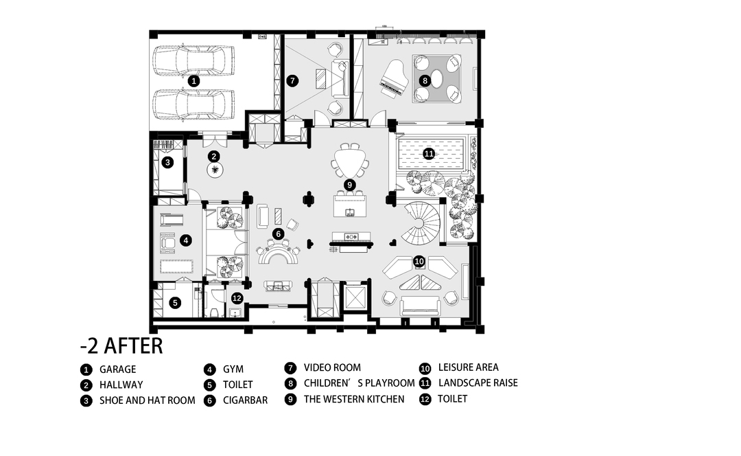 我们设计师通过空间的规划与巧妙布局,在自然与人工之间寻找平衡。在进门玄关处设计隐藏式梯形鞋帽柜,并以两扇黑白分明的双色门强化室内与室外的界限,将玄关与室内分隔。在地下室大刀阔斧地拆除部分墙体改为宽阔的落地窗。为房子量身定制排水方案,增设隔潮墙,让地下空间免受阴暗潮湿的困扰。设计钢板与实木混合的旋转楼梯。新增雾霾蓝百叶窗,在地下室模拟自然光的装置艺术。全屋的软装陈列不会过度刻意,传递出祥和悠闲的生活方式。