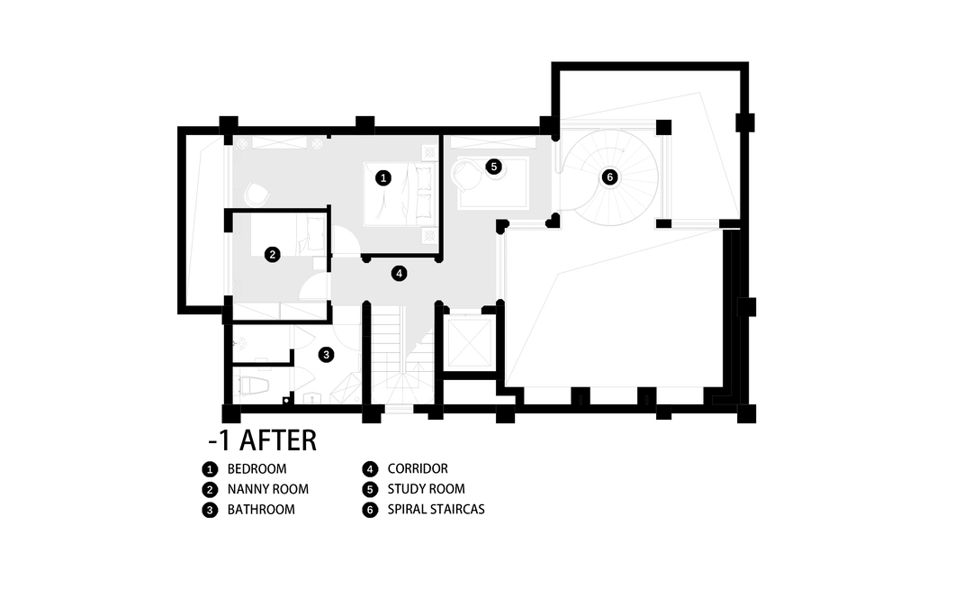 地面以下的空间原始采光条件并不理想,昏暗且潮湿,如今被改造为通透、明亮而轻盈的状态。我们设计师选择了钢板与实木混合的设计,让旋转楼梯拥有了刚柔并济的美感,这道楼梯不仅连接着不同楼层,蜿蜒向上的线条营造出庄重典雅、富有流动性的氛围,成为空间中颇具有功能性的“艺术品”