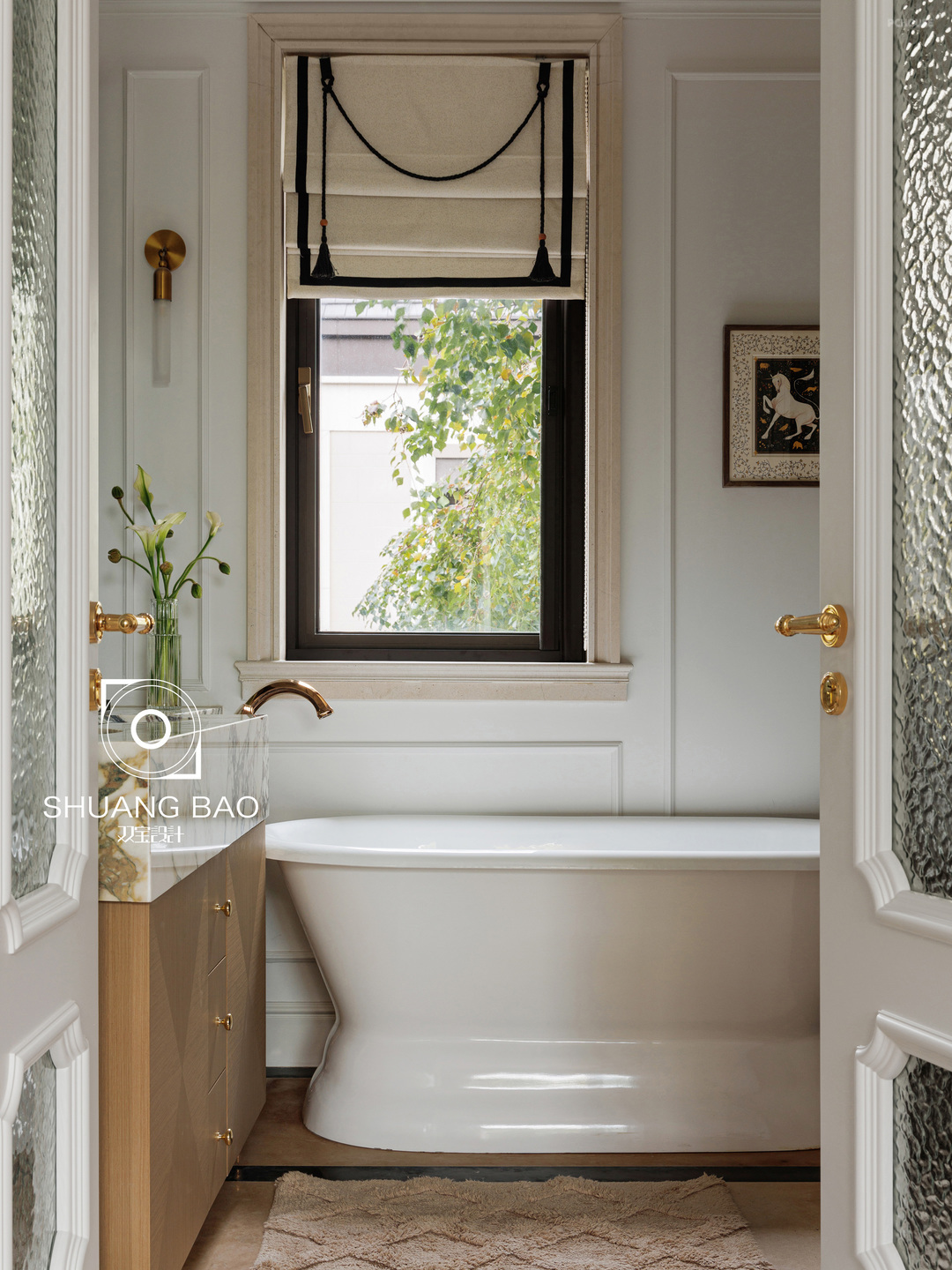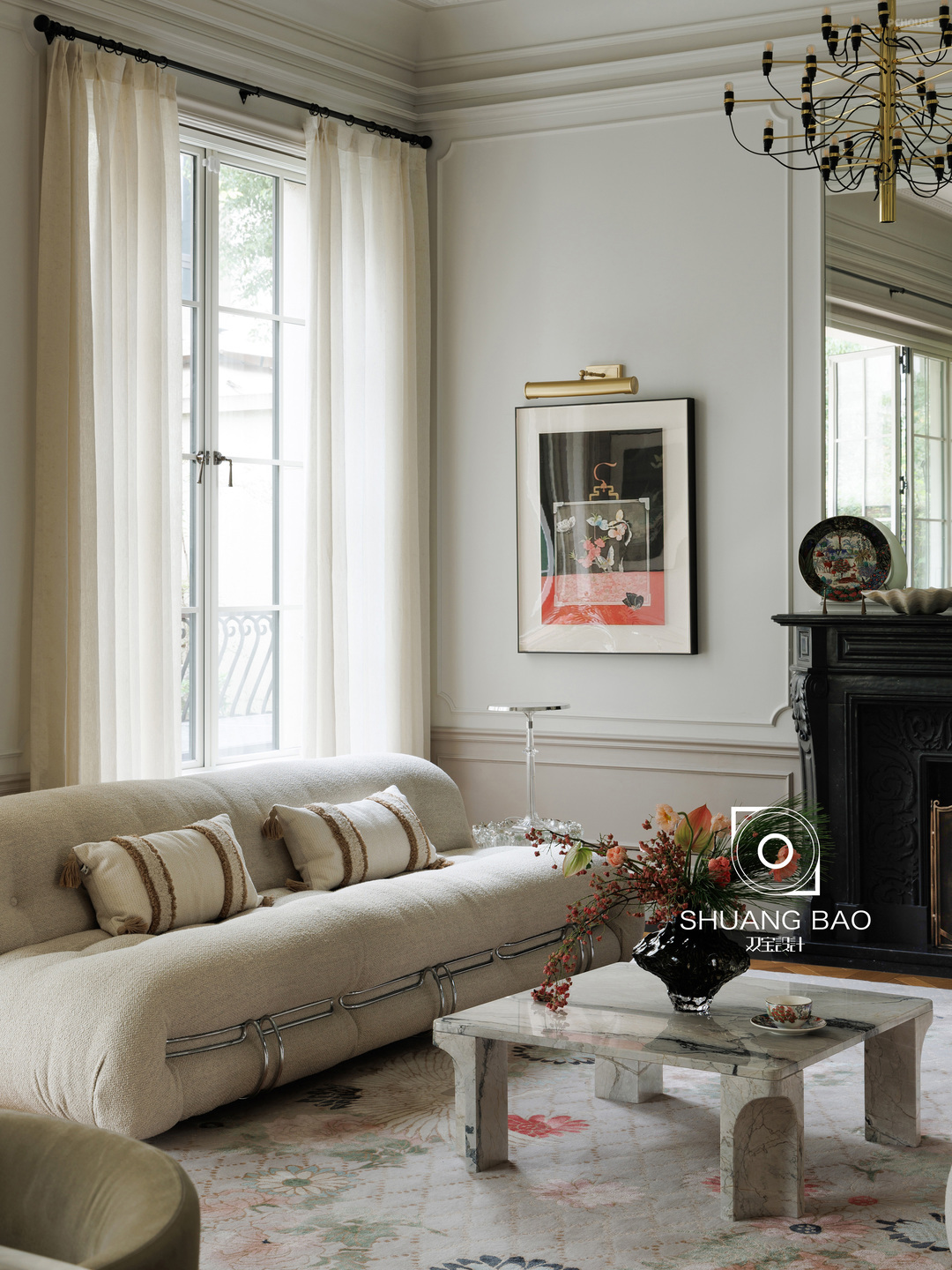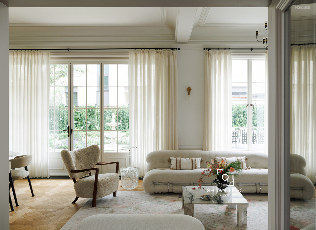 吊灯来自Flos,沙发来自Cassina,羊毛椅来自&tradition,玻璃小边几来自意大利glas,茶几来自Gubi。壁炉两侧的挂画来自艺术家文艺的国画《春风无限》和《牵丝戏》。软装的陈列不会过度刻意,在一派祥和之中,足以窥见所传递出的悠闲生活方式。落地窗让光线畅通无阻地在室内流动,将花园的美景引入室内,若隐若现的薄纱又能保护室内私密,拉上窗帘,家即可成为一个超脱城市喧嚣的内向宇宙