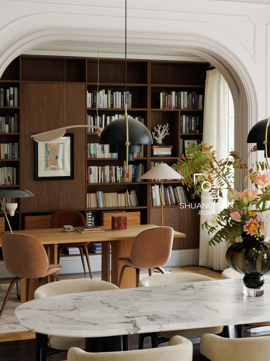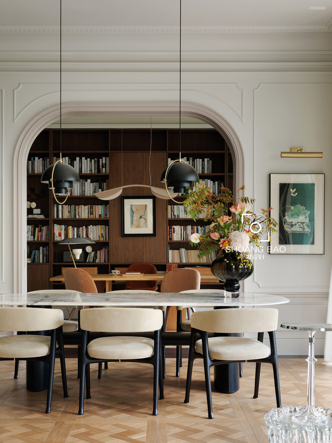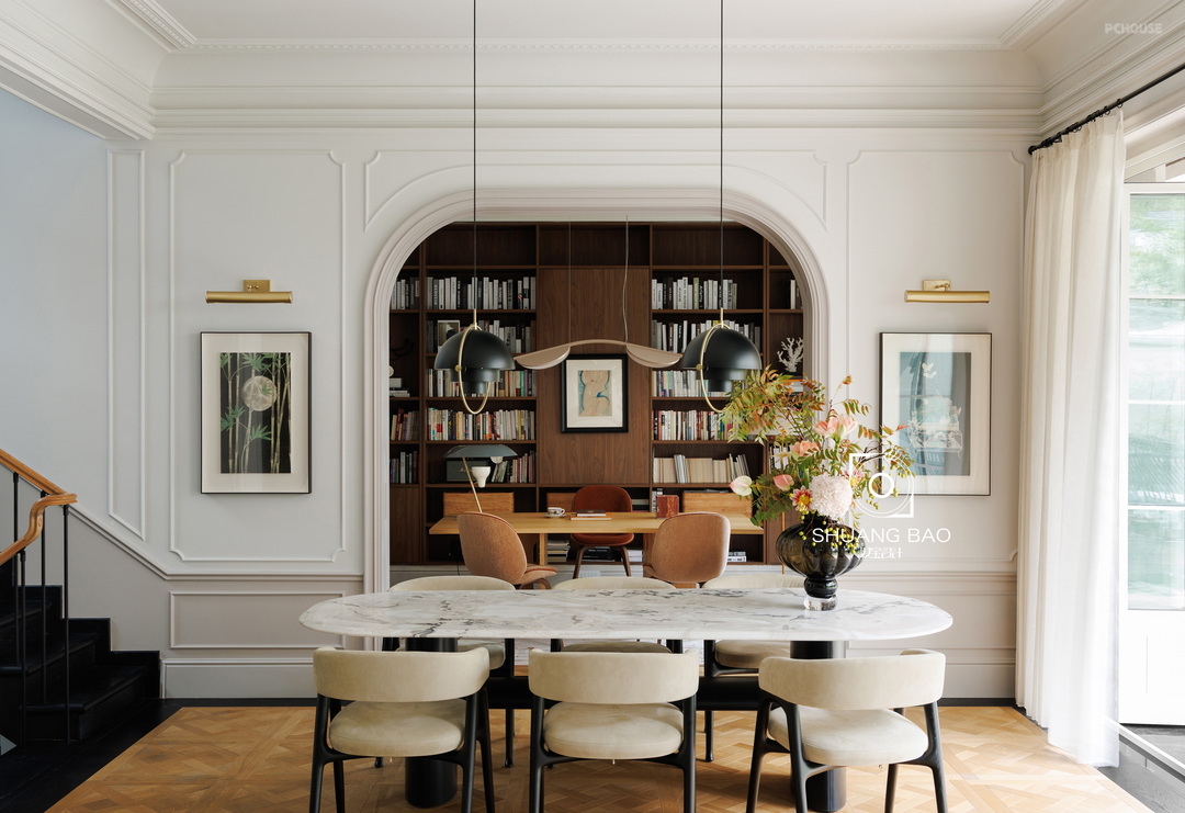 餐桌餐椅都来自Baxter,吊灯来自Gubi,挂画是艺术家文艺的国画《游园》和《潇湘月华图》。可开合的隐藏式推拉门让书房可以化身为独立空间。圆润的弧形门框让书房在敞开时柔化空间的视觉界限,带来优雅和谐的美感