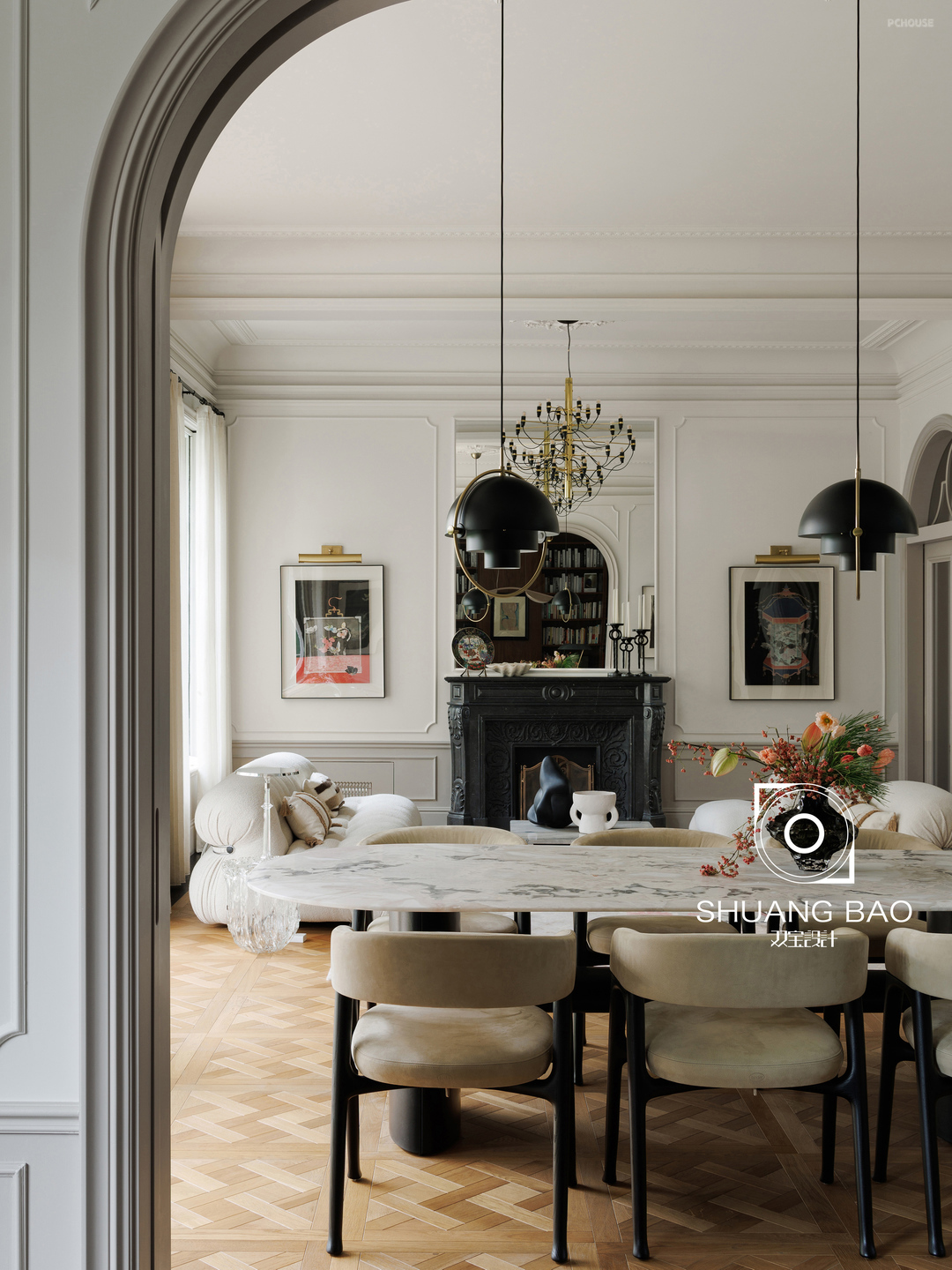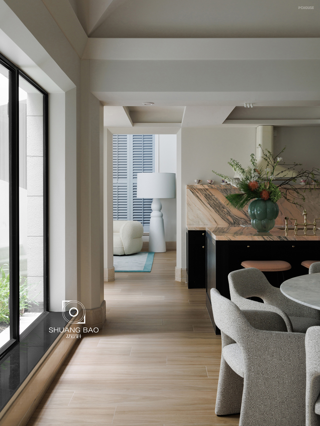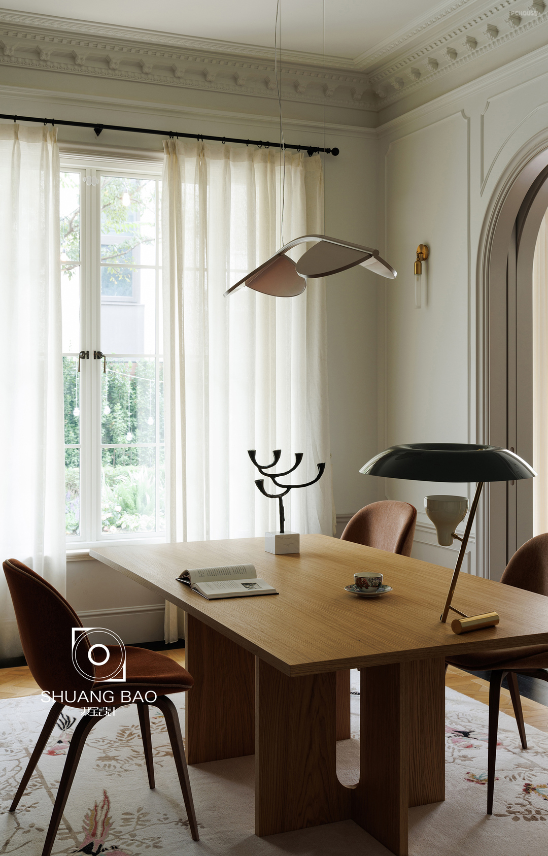 餐桌餐椅都来自Baxter,吊灯来自Gubi,挂画是艺术家文艺的国画《游园》和《潇湘月华图》。可开合的隐藏式推拉门让书房可以化身为独立空间。圆润的弧形门框让书房在敞开时柔化空间的视觉界限,带来优雅和谐的美感