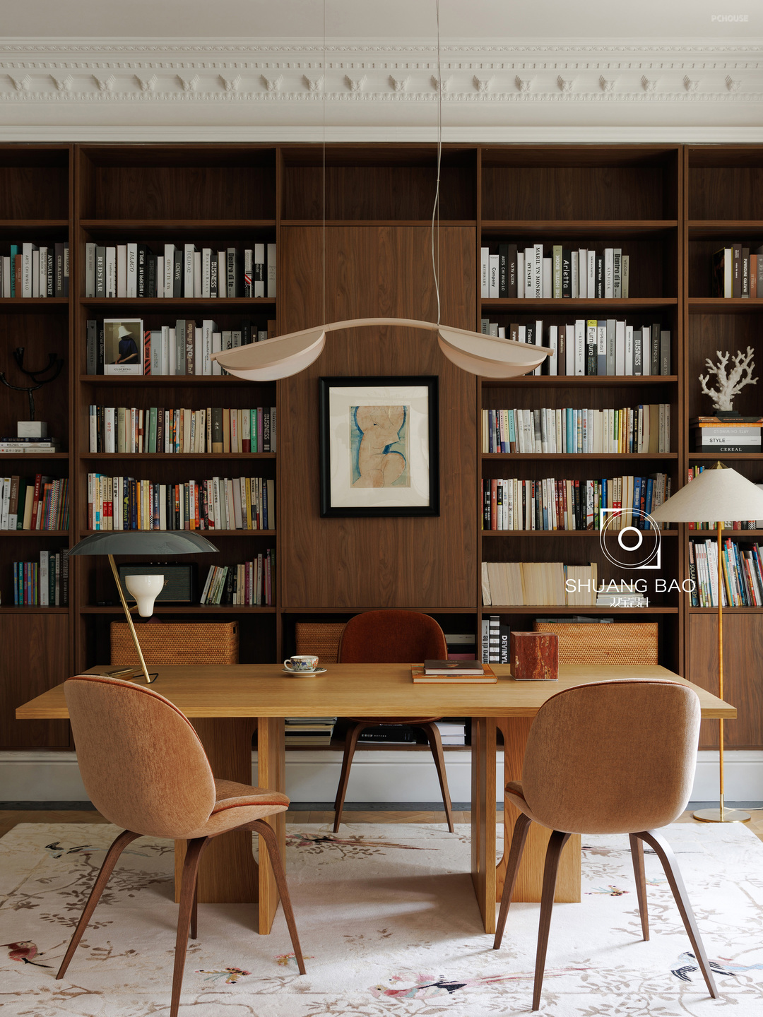 吊灯来自Flos,落地灯和椅子都来自Gubi,书桌是丹麦Menu 的Androgyne系列。满墙的胡桃木书架呈现出木材特有的天然质朴与温润,与身俱来的清雅感让书房成为感知层面的延展性容器,每一次沉浸式阅读与冥想,都是回归内心的旅程