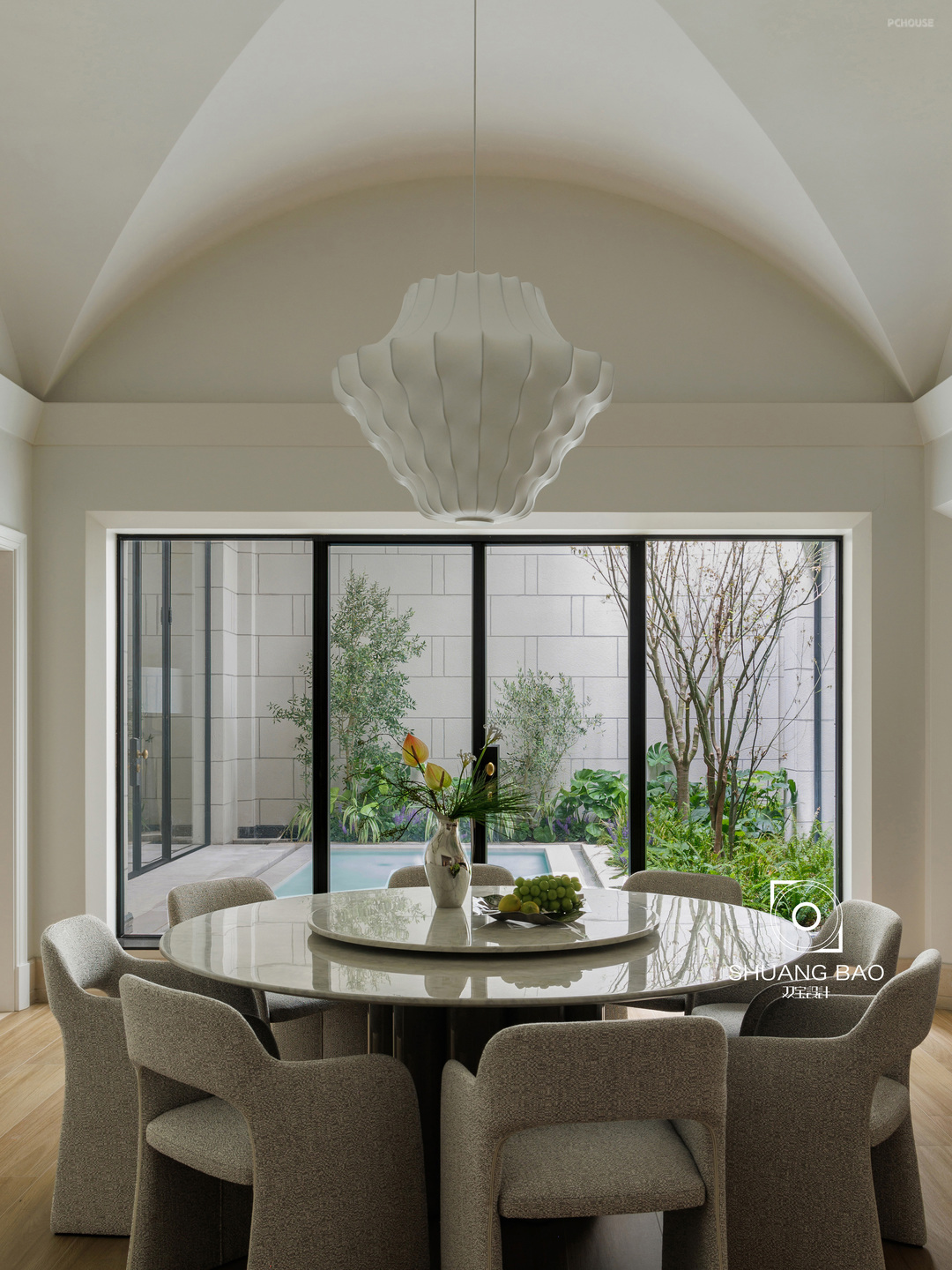 餐厅上方的穹顶设计,流畅的弧形斜面兼具浪漫与力量感。餐桌来自HC28,餐椅来自锐驰,吊灯来自丹麦Normann Phantom,花瓶与果盘来自丹麦Georg Jensen。地下室的落地效果令人满意,屋主回忆最初看到的效果图非常诧异与惊喜:“张肖老师围绕着两个天井的光源去展开各个重要的空间设置,同时还在既有房屋结构限制下,把我们喜欢的元素都巧妙融入。谁能想到原来昏暗的地下室也能拥有阳光、绿植和涌泉。”