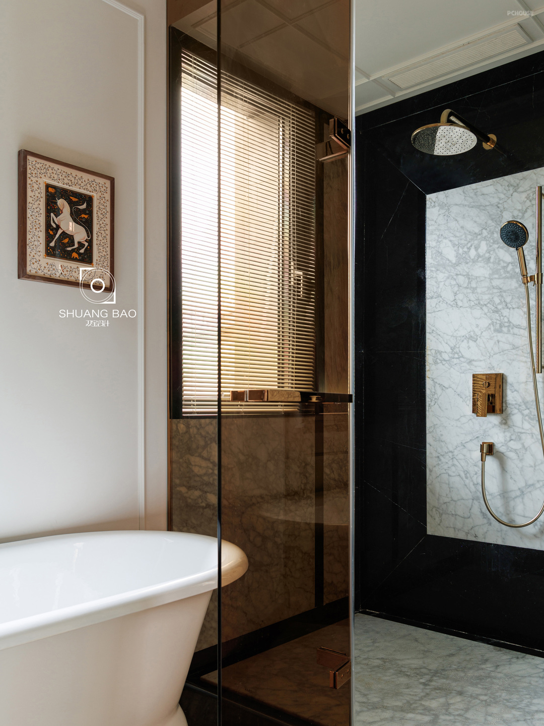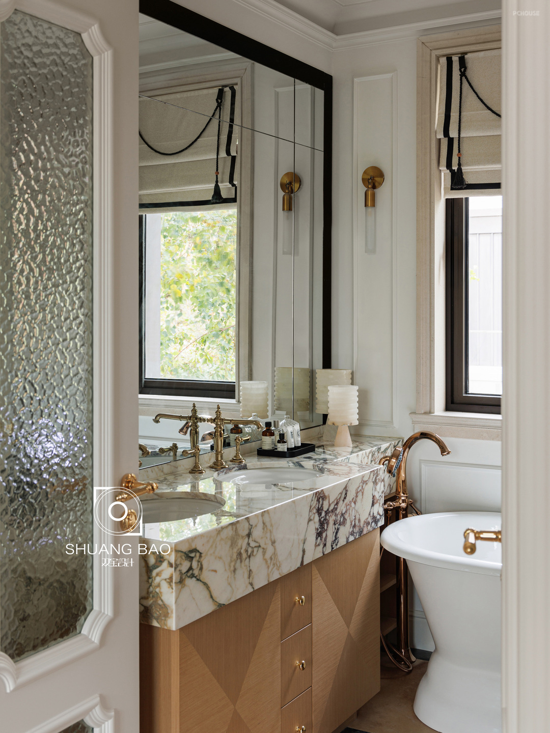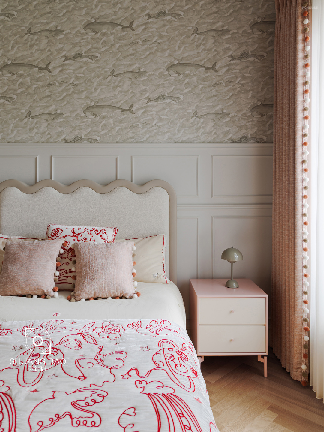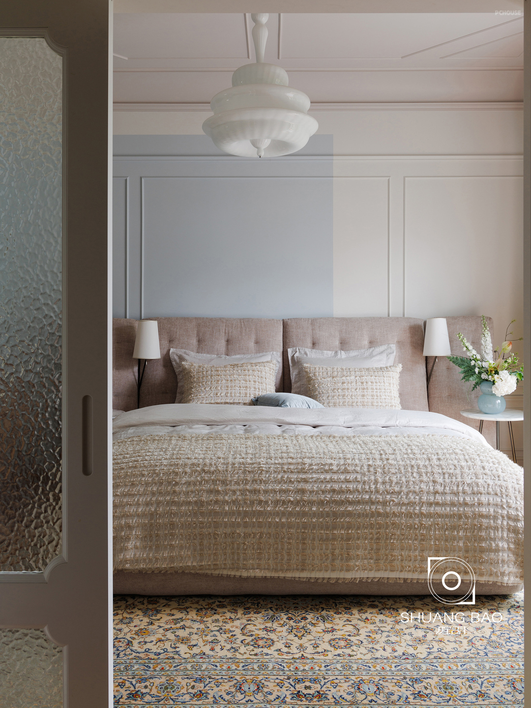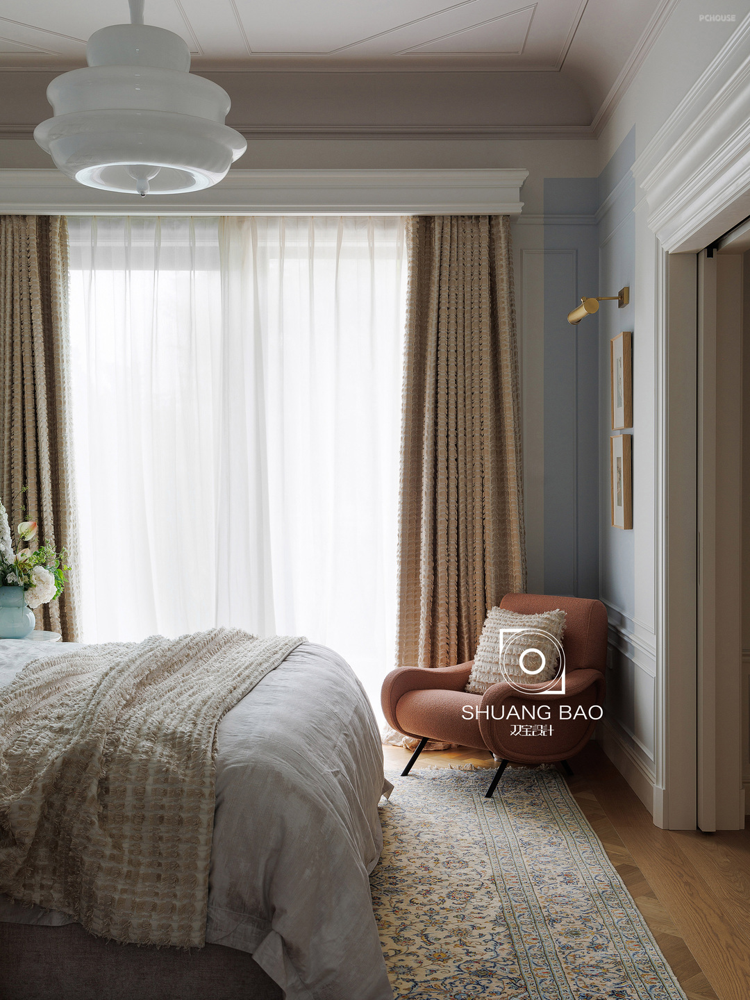 推开水纹玻璃的法式双开门,局部雾霾蓝的墙面,温和的色调与线条,在主卧营造更加松弛与静美浪漫的休憩场景。金丝的纱线交织立体流苏的定制窗帘,预留8公分的法式拖地,像摇曳生姿的裙摆一般优雅华丽。Vistosi吊灯圆润的造型提炼空间中的轻柔气质,展现休憩之所的悠闲