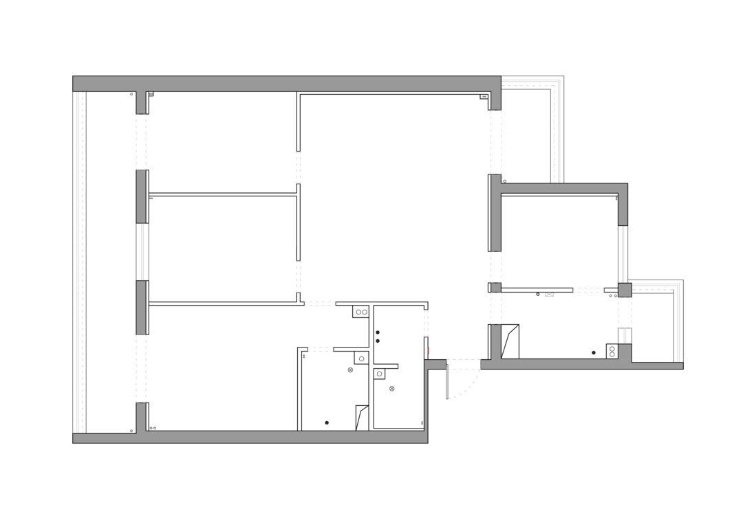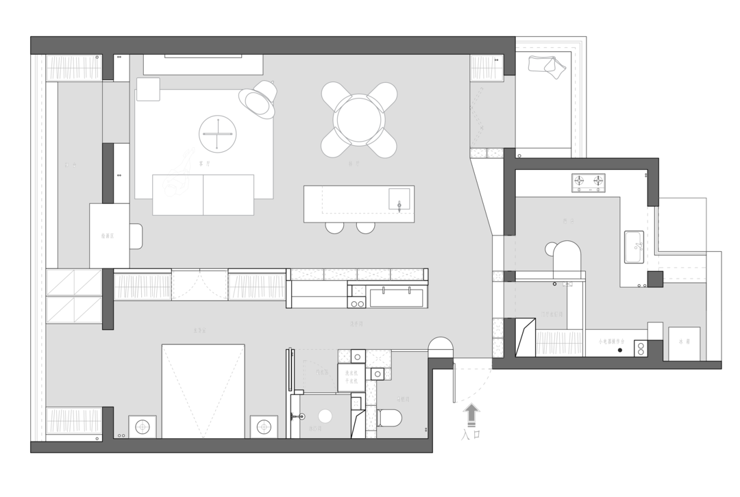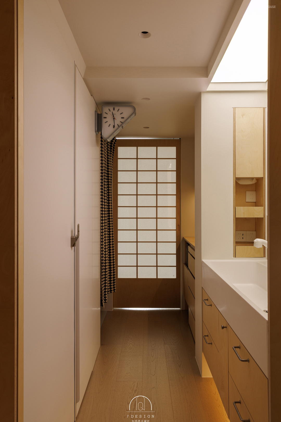 1、打通的门口长条浴室与主卧之间的墙,实现分离式的卫浴体验,走廊两侧盥洗、家政、洗衣、淋浴、马桶一应俱全,互不干扰。