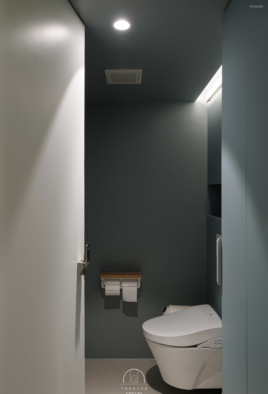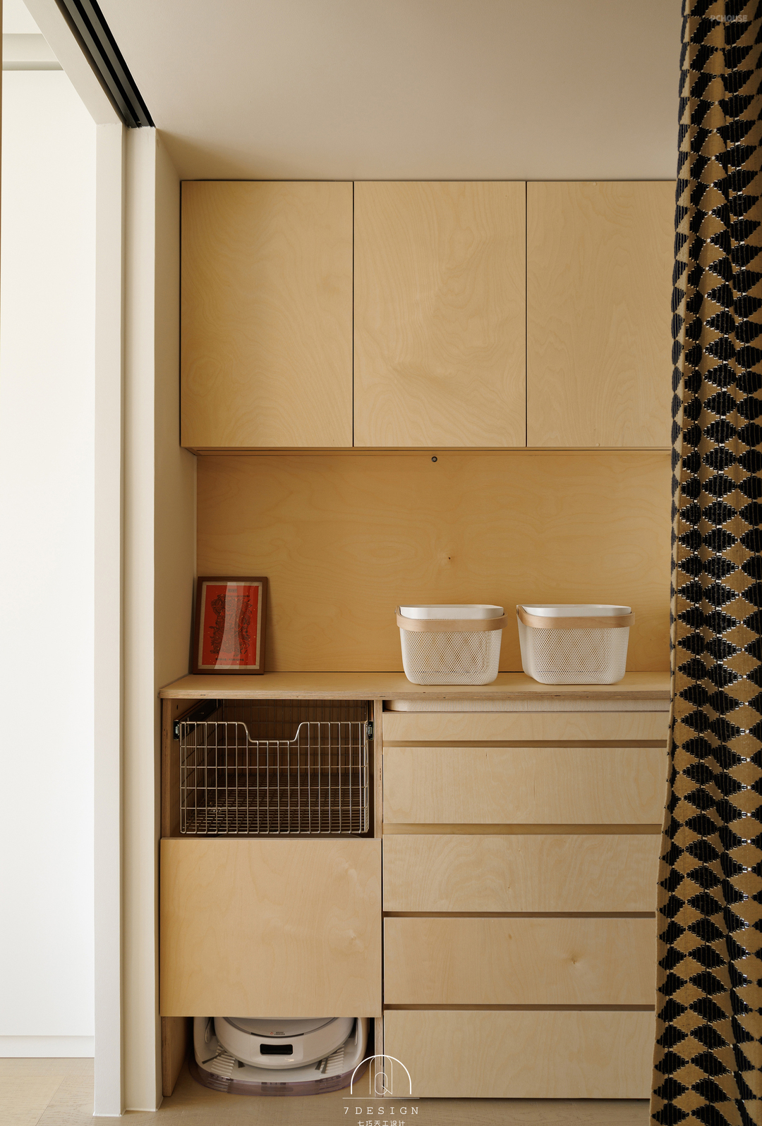 紧挨门口的是独立马桶间,原先是这里管道丛生,见缝插针地设计了隐形家政柜和工具柜,隐藏管道。