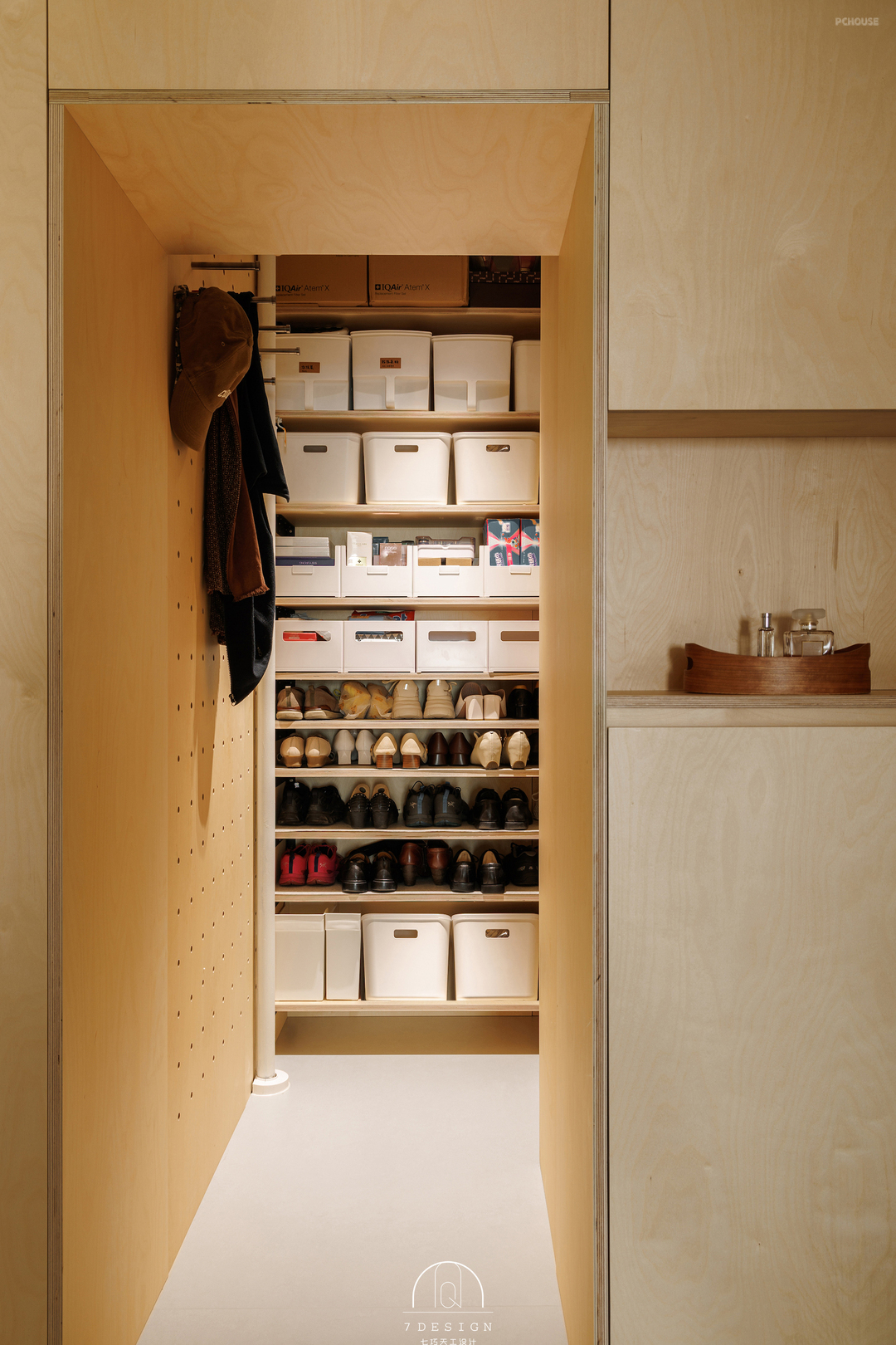 鞋柜旁边单独加入了储物小仓库,老年人进出门要随身携带很多东西,小仓库更适合老人的生活习惯,也更方便收发快递和囤货,仓库没有装门,以免小空间开关门绊倒老人。