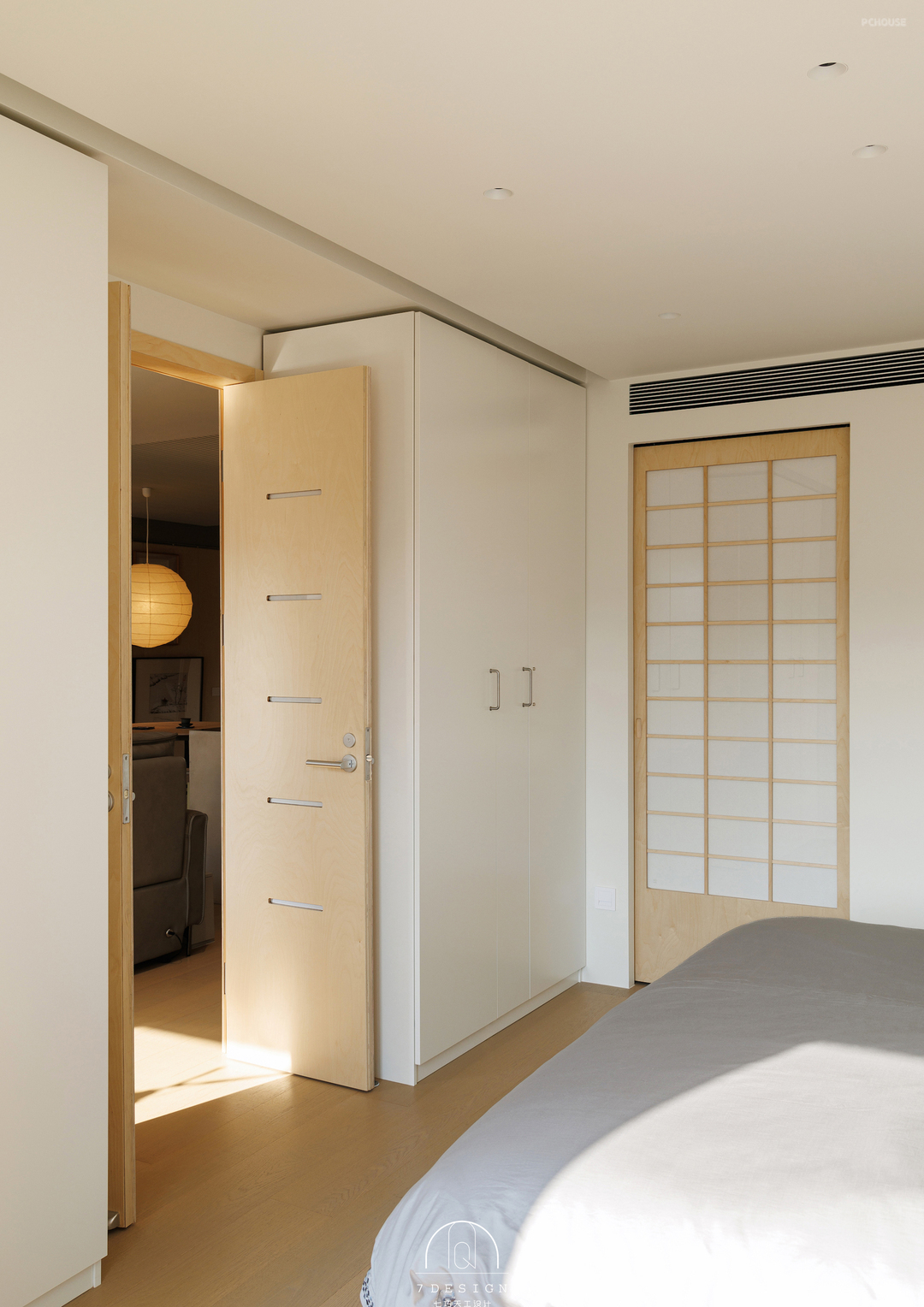 浴室这里是有推拉门的,床尾对面还含一处双开门,洄游动线改变了原来转角开门的憋闷感,拆除隔墙打造的环形动线,主卧去客厅和门口都更方便,也让整个房子的阳光和空气自由流转。