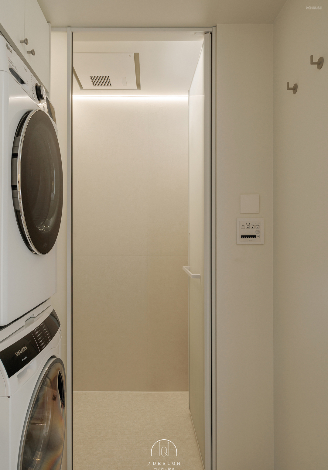 隔壁是带洗衣房的淋浴间,含分类脏衣篓和毛巾区;浴室地面是日本进口的发泡塑料卷材,墙面还留了透光孔和坐浴台,洗澡时可以坐着借力,不开灯也不会太暗。