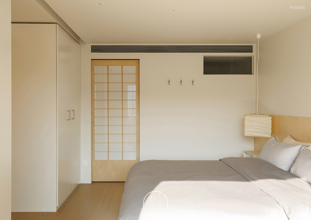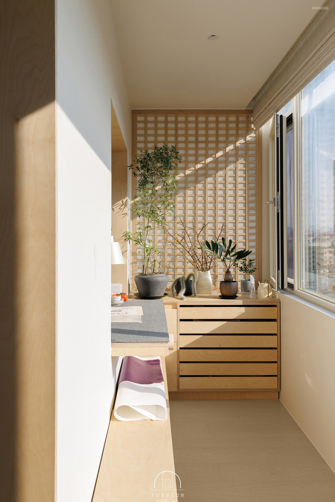 这里的长阳台是原来就有的结构,隔墙含承重无法拆除,设计师将它一分为二,一部分作为木格栅窗归入主卧。