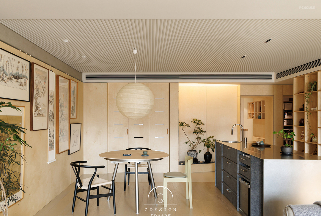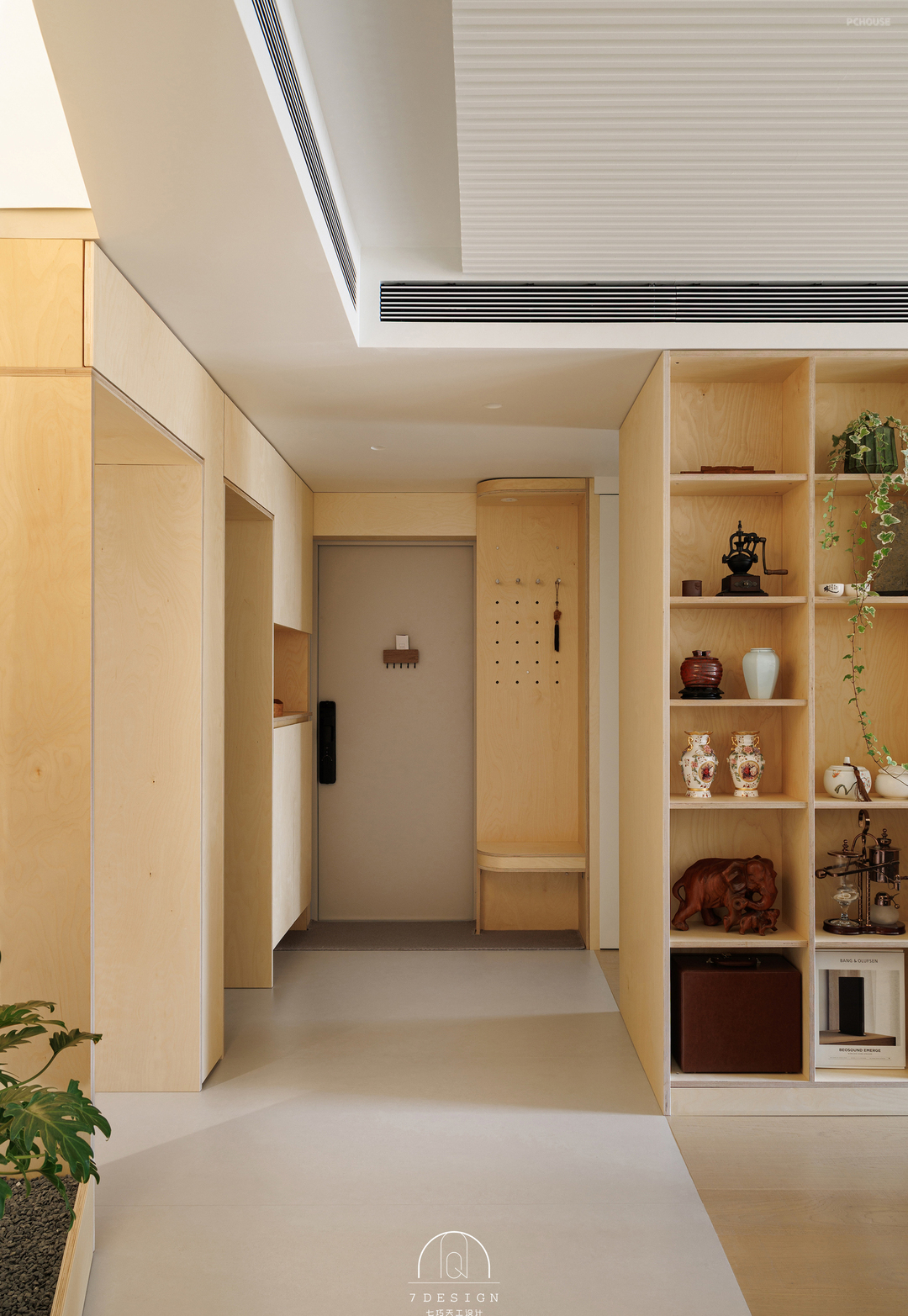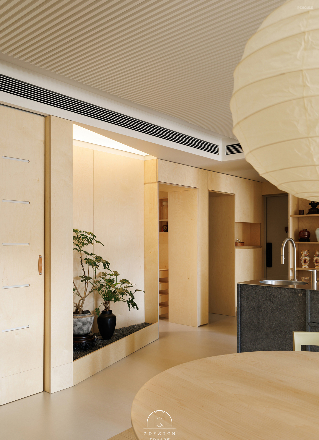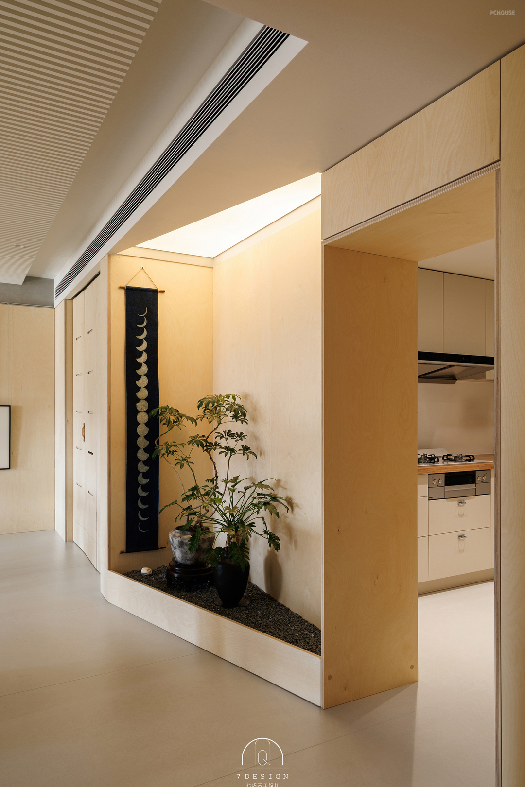 北侧设计师利用小卧室和厨房门的厚度差做了植物角,一进门就能看到视觉上增加了东方禅意。