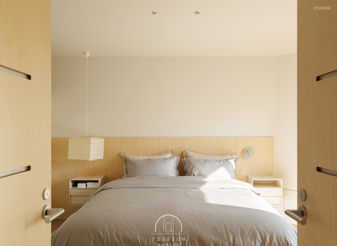 原来封闭的阳台拆进来后,仿佛换了套房,床区位置没变,改成舒适雅致的浅木色。