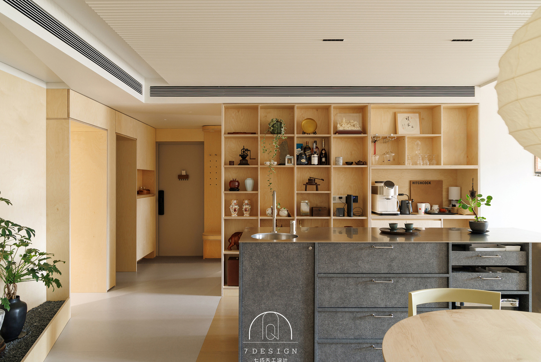 餐厅一侧加岛台+餐边柜陈列架的结构其实也更适合老人家使用。