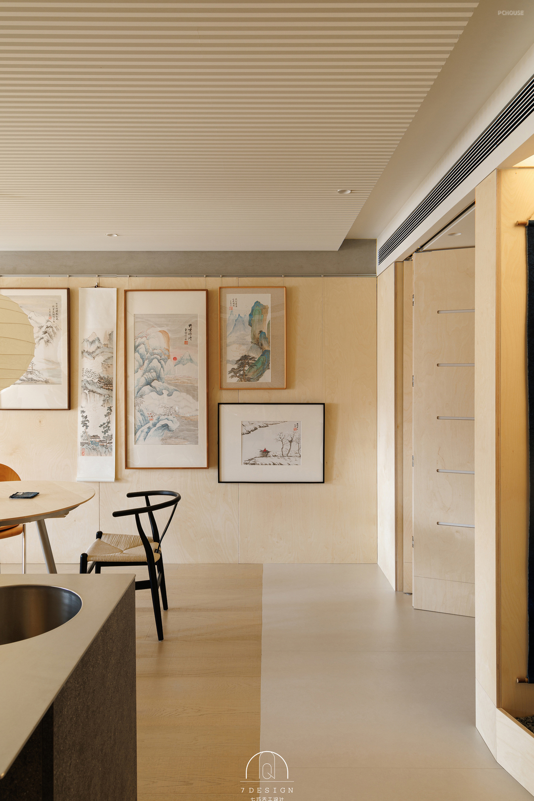 老人退休后,爱上了国画,餐区海洋板墙面很自然的变成了展示区。