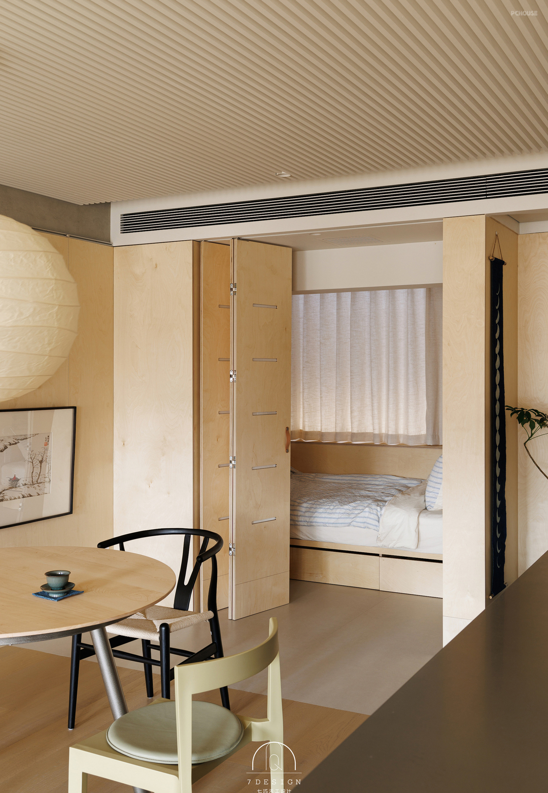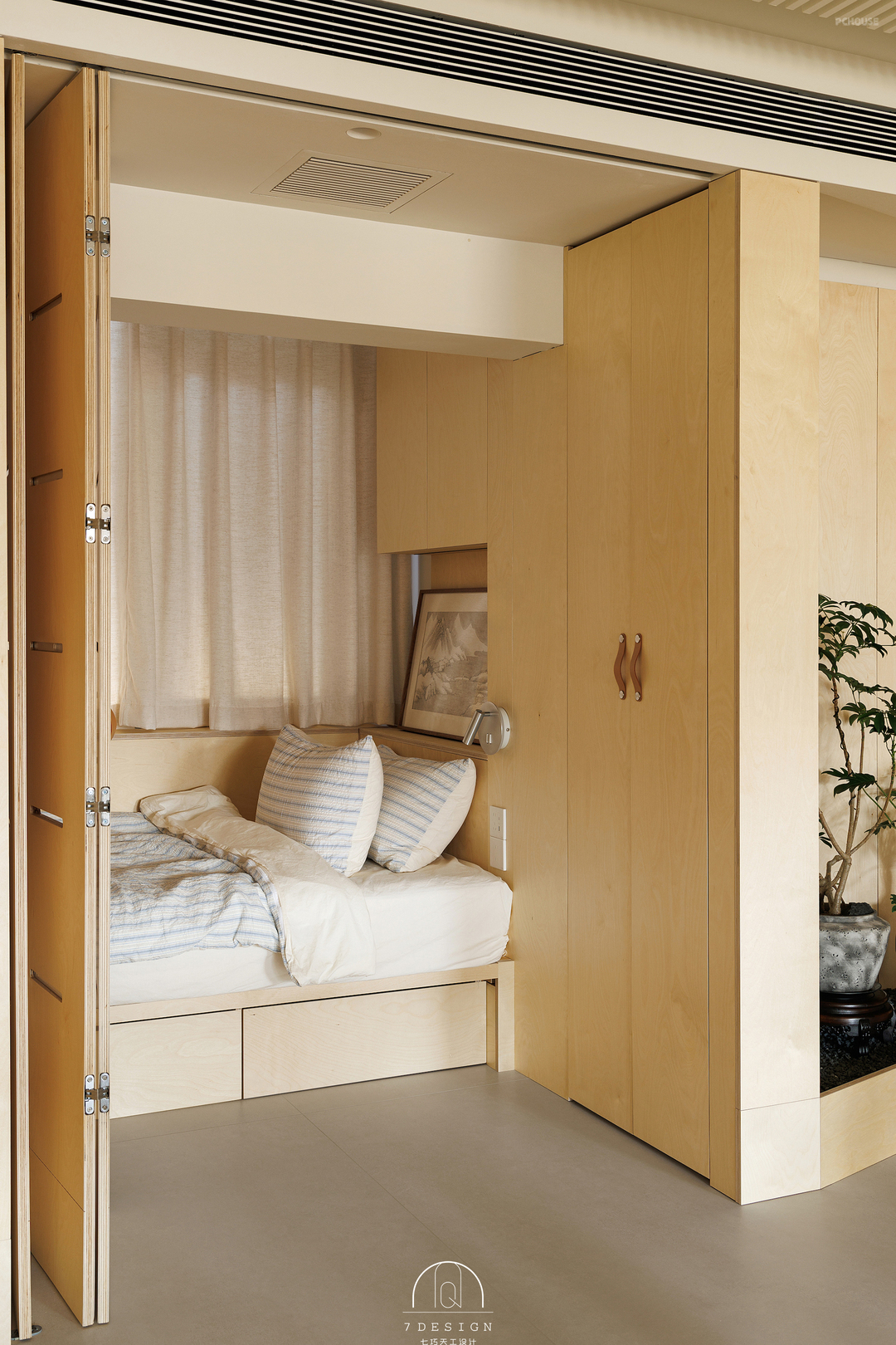 拆掉的书房和孩子房,改造后的大客厅也包含了这两种功能,首先是把客厅北侧杂物阳台改成了一个开放式的小卧室。折叠门是可封闭的,并且还有完善的收纳和睡眠系统,孩子们可以偶尔过来住也很方便。