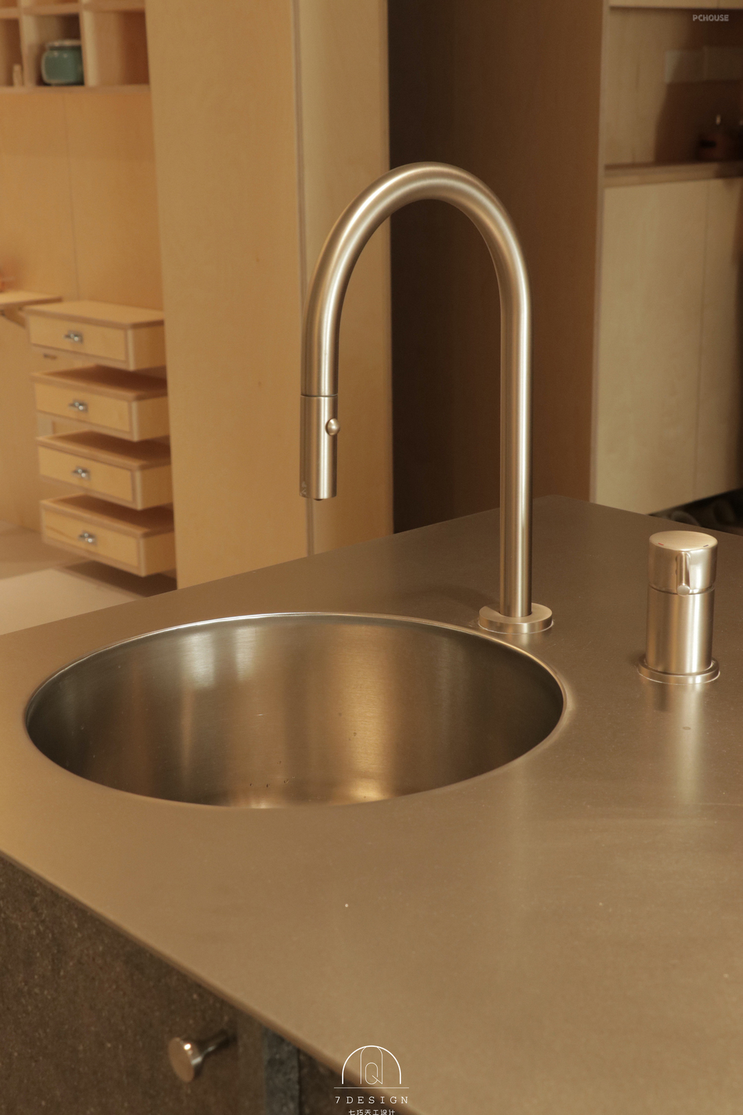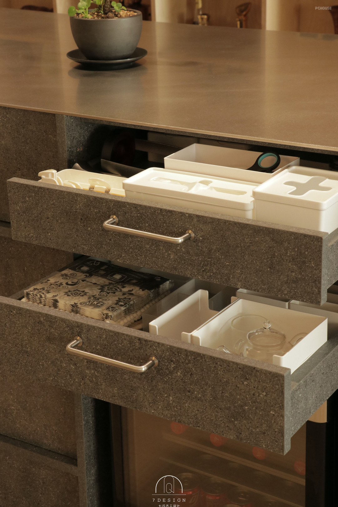 岛台的另一个好处是更方便洗茶器,设计师设计了更多抽屉,海量茶叶饮料、酒水、密封袋都能瞬间找到。