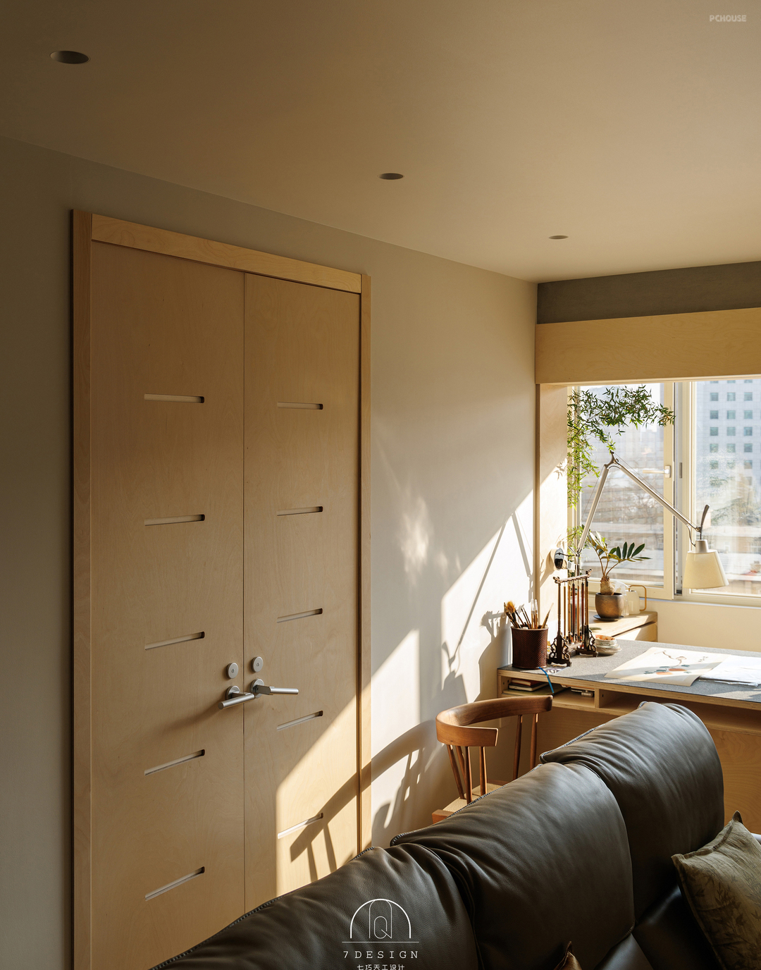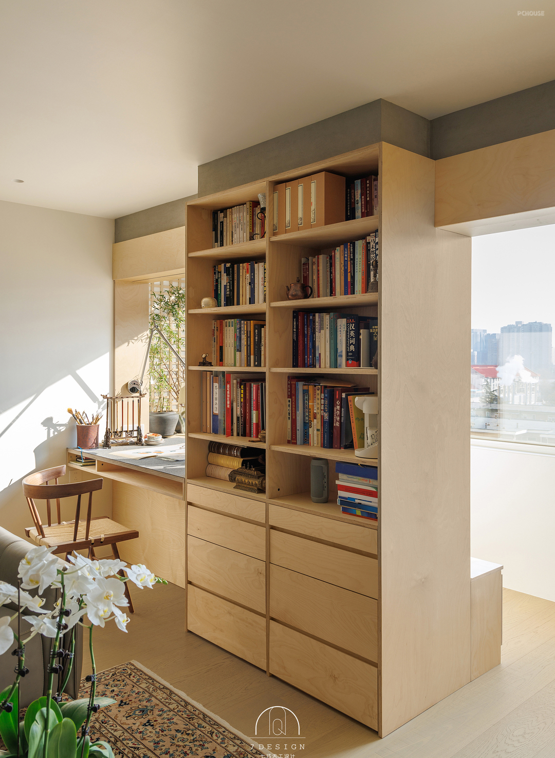 另一半客厅区的阳台隔墙则安排了妈妈绘画的书桌、爸爸的书架和植物区,杂物阳台也能变功能大师。