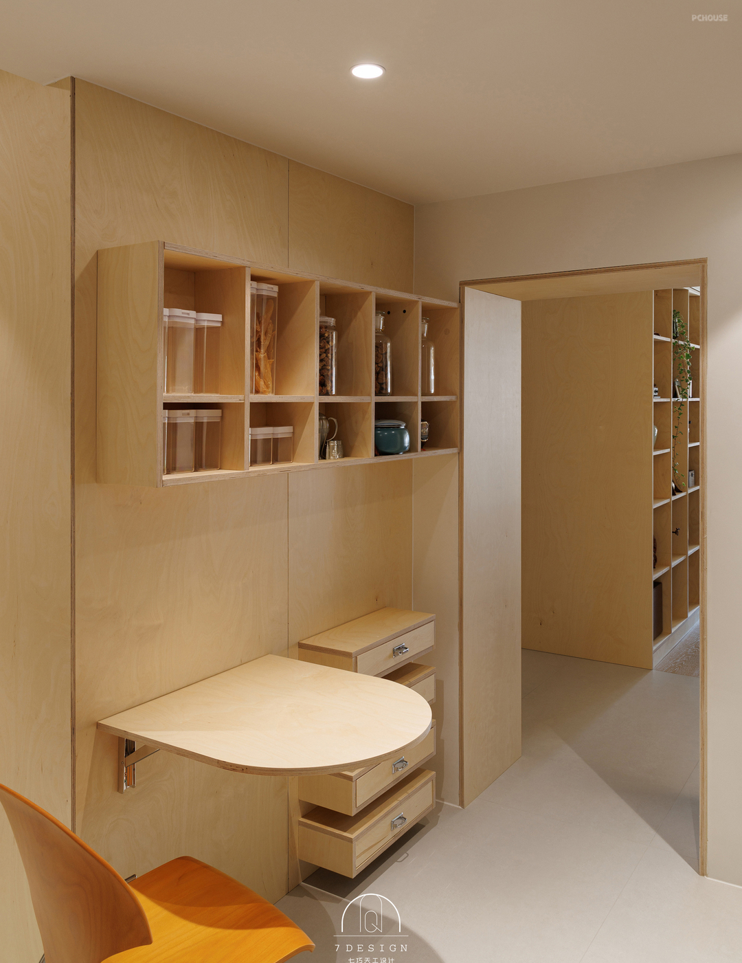 厨房右侧墙上也用洞洞板做了开放格,可以分类收纳各种调料和五谷杂粮。开放格的下面也设计了折叠餐桌,平时用餐不想端菜去到外面餐区,就可以把它放下来,轻体的桌板老人自己可以轻松收放。