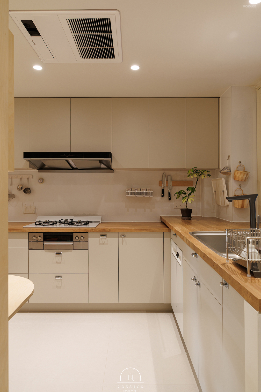 植物角旁边进来就是厨房,同样没装门,独立厨房即便隔了一部分面积给玄关,仍然保留了原来的两屋结构。