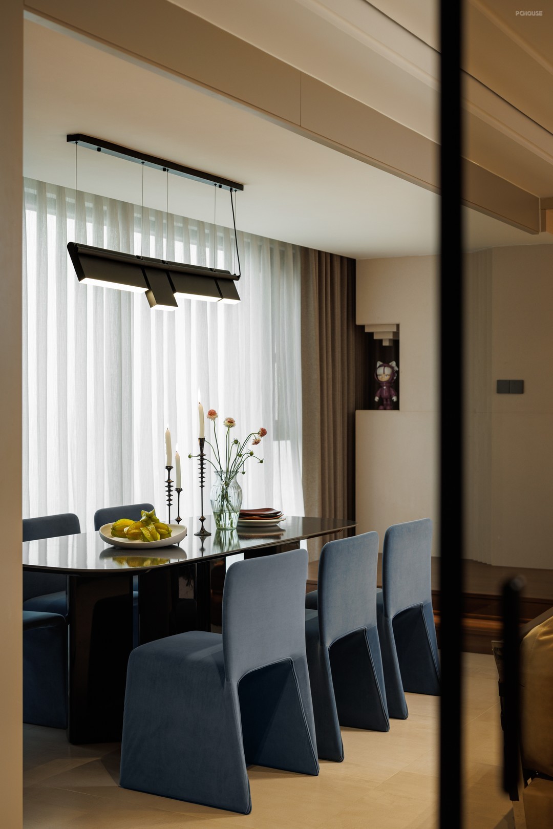 灯光设计上,使用现代简约吊灯,光线柔和且富有层次感,营造出温馨的用餐环境。