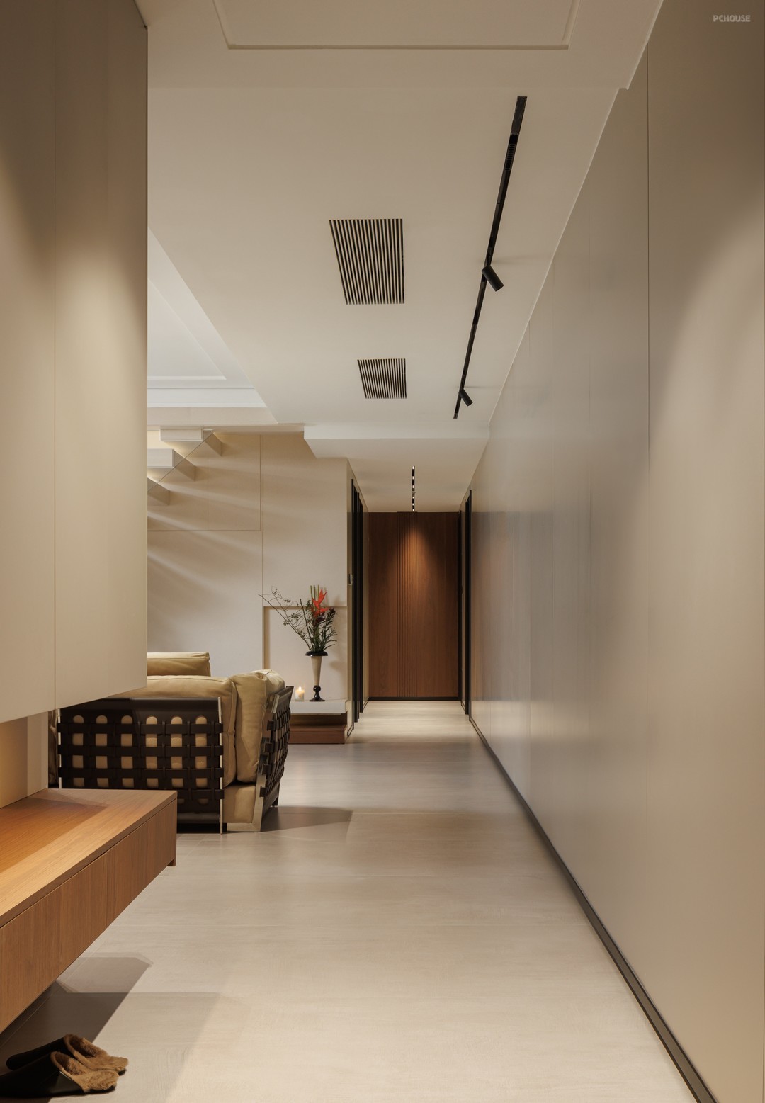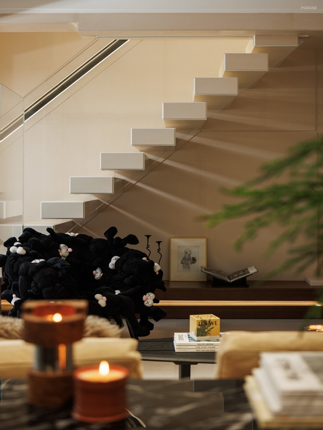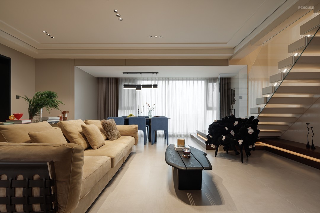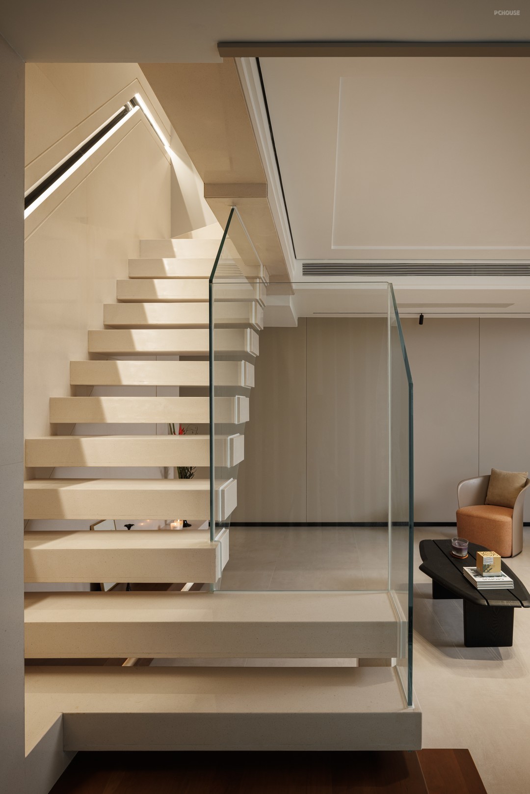 灯光设计上,使用隐藏式灯带,通过多层次的光源营造出舒适的光影效果。大面积落地窗引入自然光,让空间更加通透。
