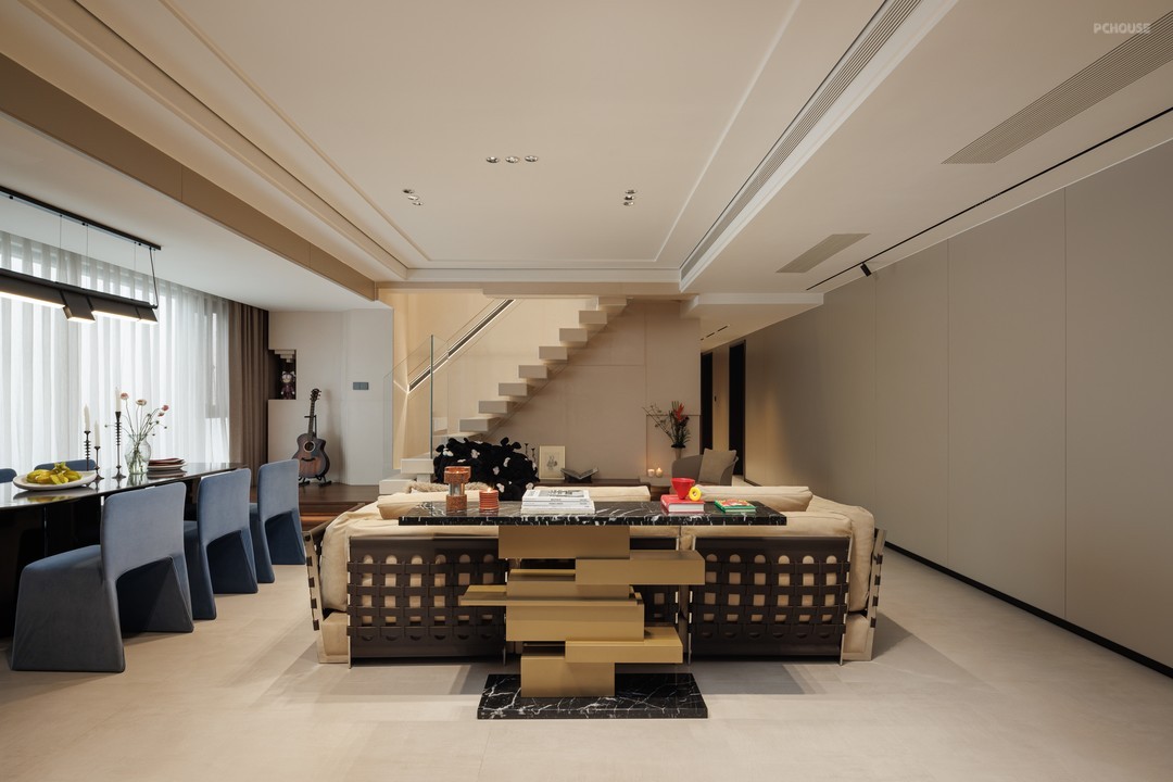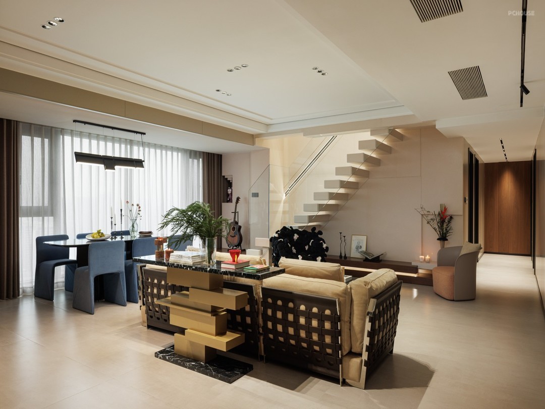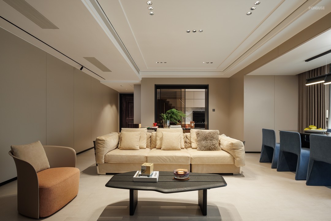 客厅注重功能性与美学的平衡。家具线条简洁流畅,选用低矮的沙发、几何形状的茶几,既实用又充满现代感。