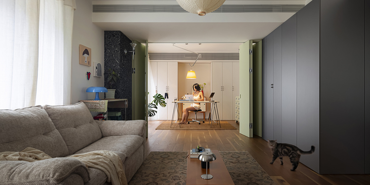 客厅通过花瓣沙发的区分,让空间一分为二、增加了洄游动线。在客厅背景墙设计书龛,根据书籍大小和种类进行分层,既可以展示藏书,又能成为空间的装饰亮点。