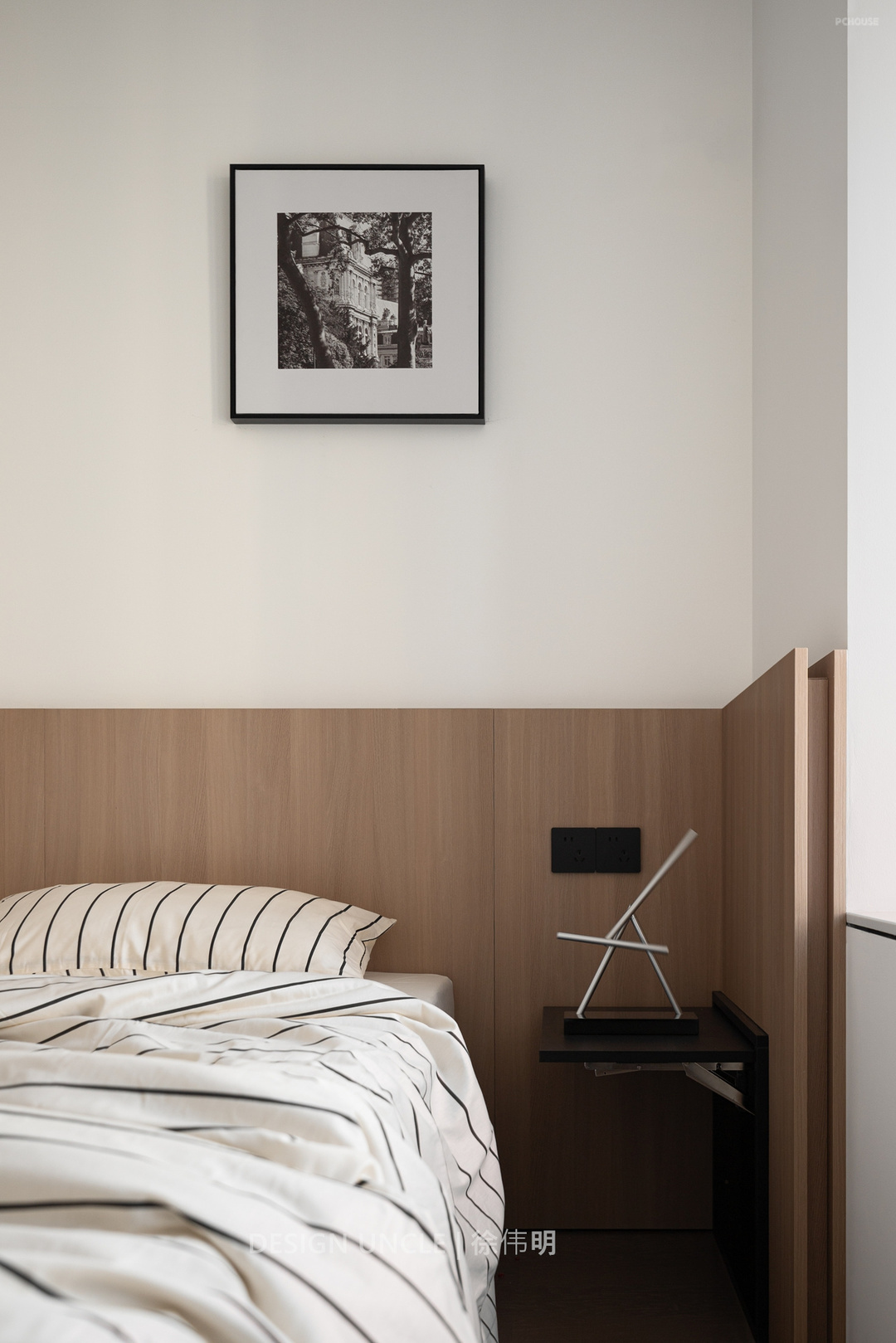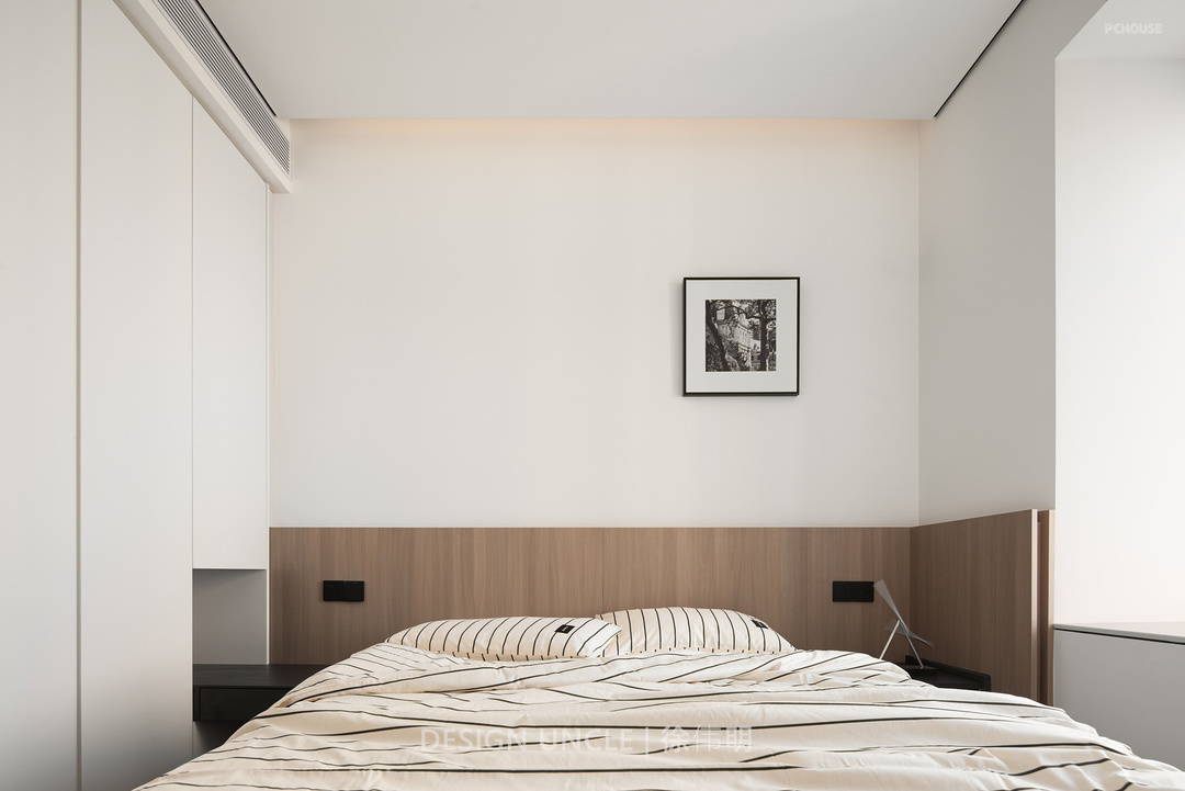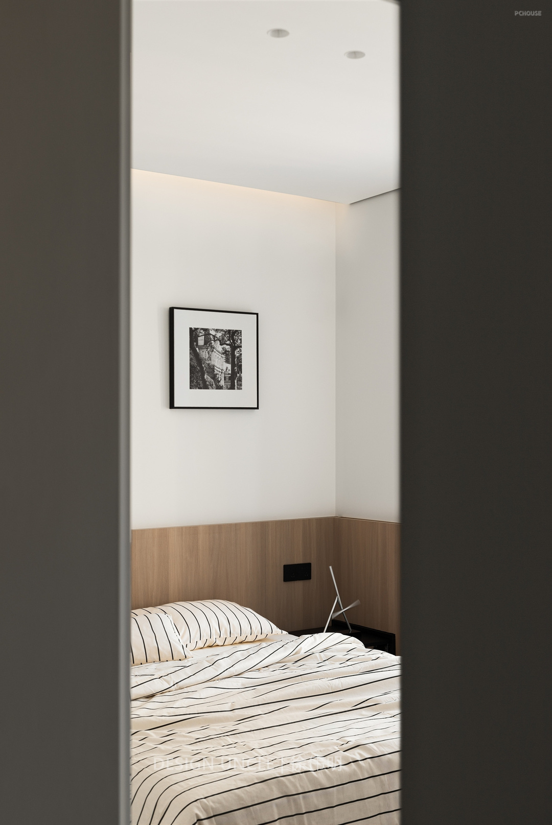 原始累赘的吊顶被去除,空间因此更加轻松,黑白极简设计,搭配驼色的床靠,雅致中增添了一丝生活的惬意。