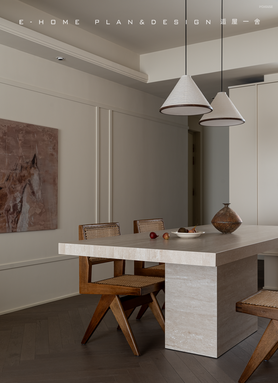 一张宽大的餐桌居中而置,桌腿线条简练,这里既是饭厅,也是茶室、书房,甚至是孩子们的手工台——生活的场景随着晨昏更替,在纹路里留下痕迹。餐厅一侧与玄关相接,鞋帽柜以挑空的柜体悄然融入,柜门无拉手,仅以细微的凹槽开启。