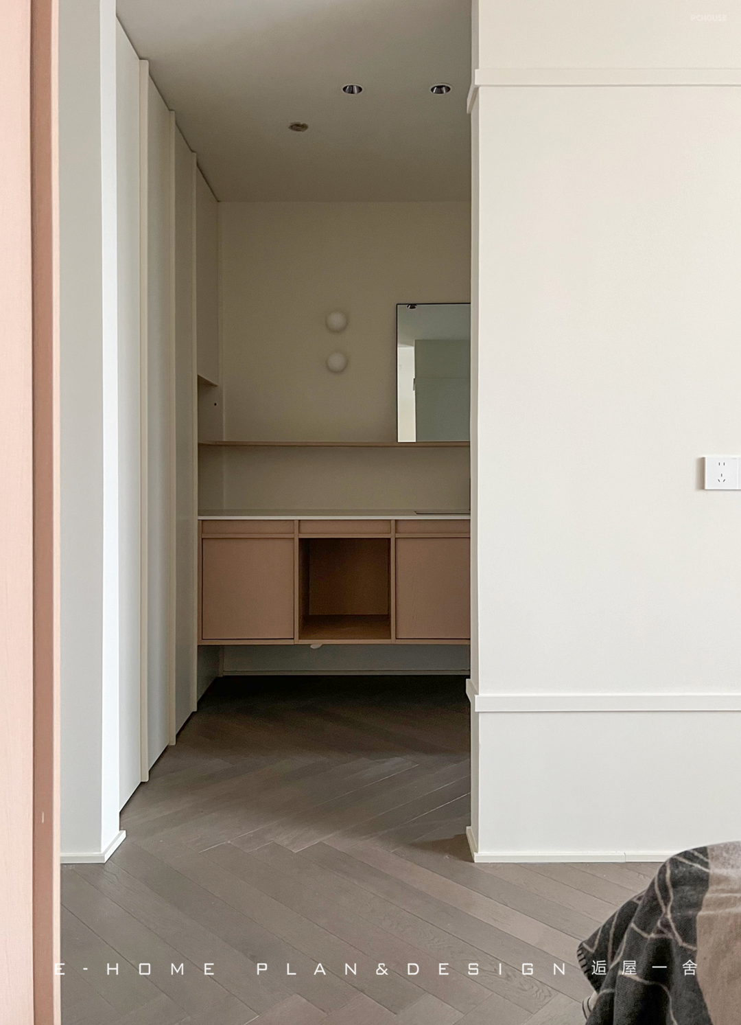 主卧是茱萸色的涂抹,骨骼线条从床背开始一路攀爬,把收纳隐匿其中。