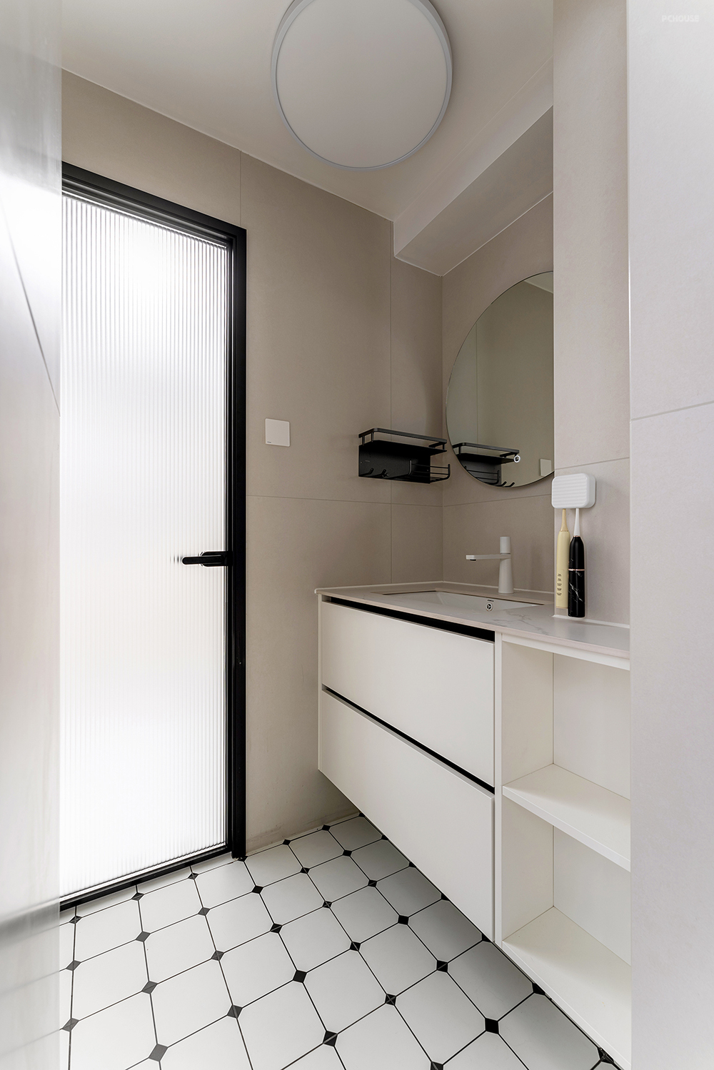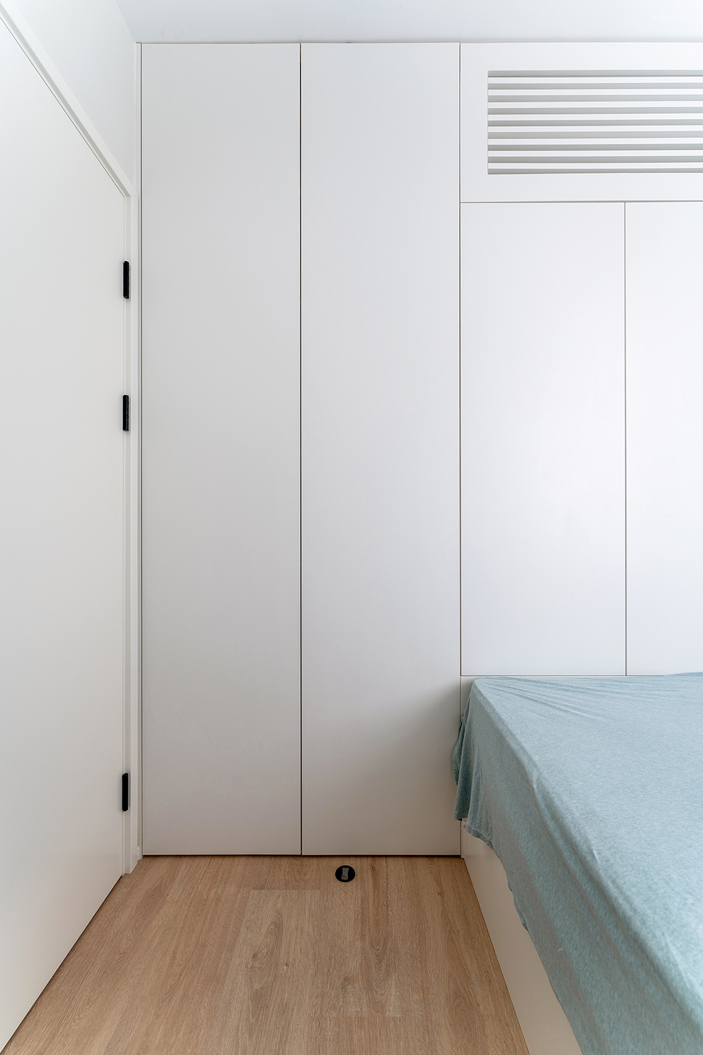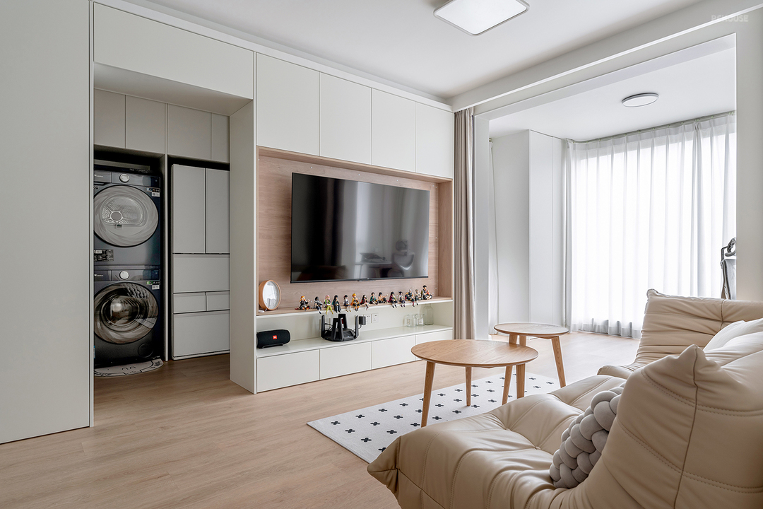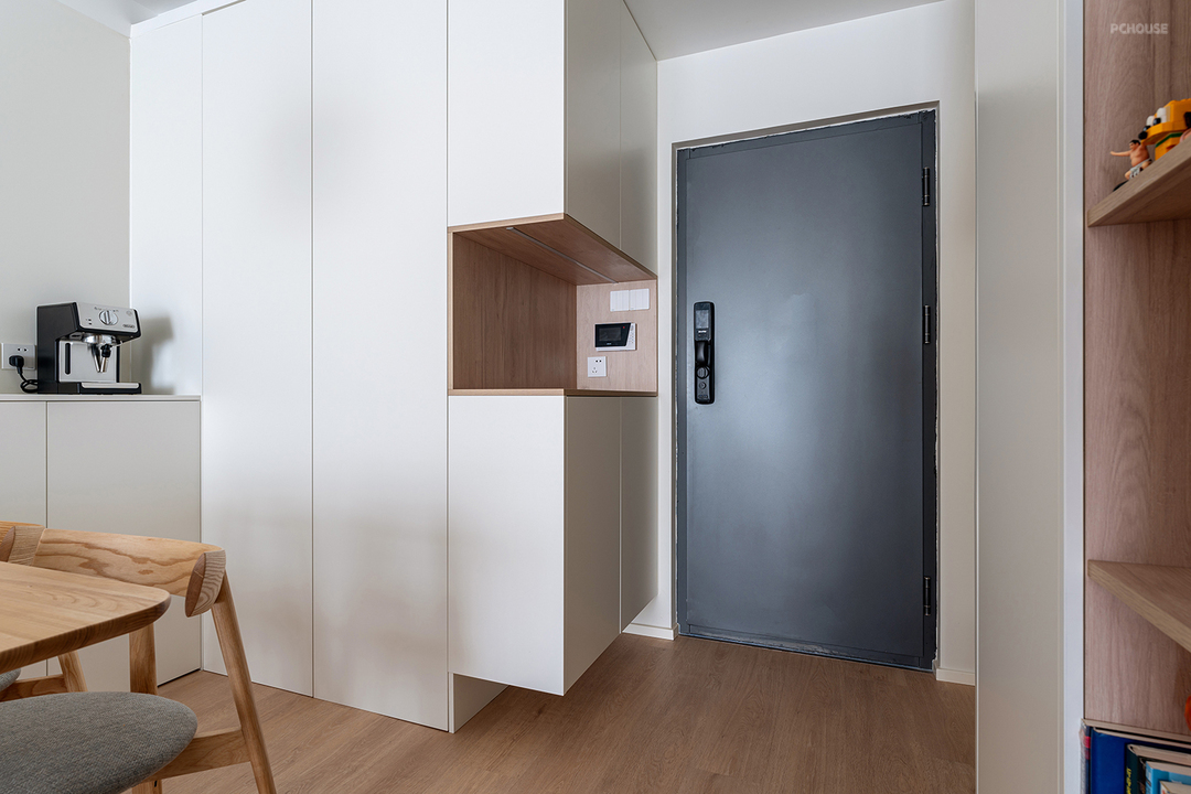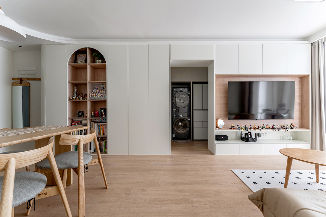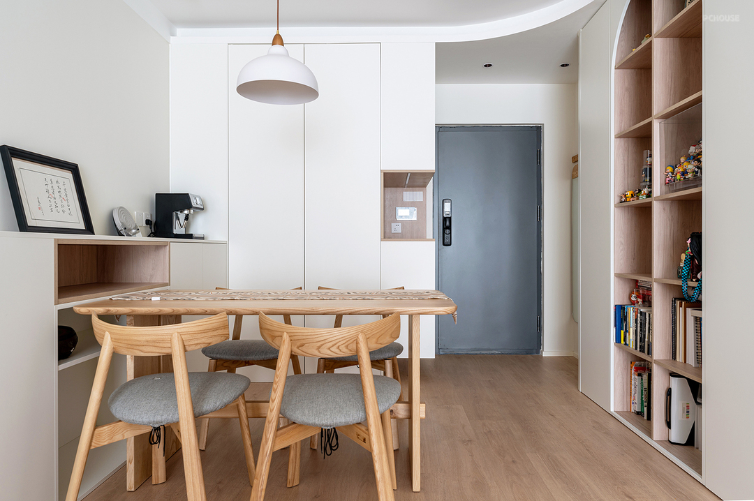 过道右侧作为承担全屋收纳的重点,由白色无把手平板柜和弧形书架组成,线条分割的效果形成空间秩序,让家月住越干净。