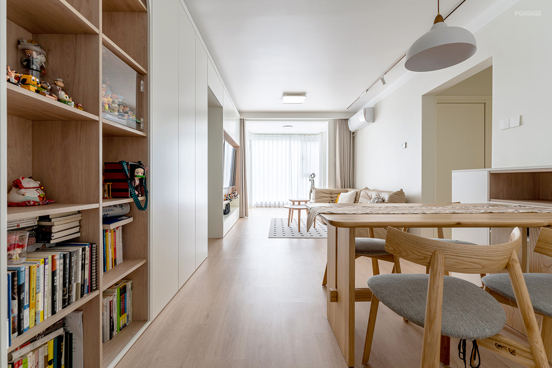 浅木色空间内,客厅与餐厅形成了自然过渡。整面5.8米的大柜子,书架错落点缀趣味摆件,既能收纳又能展示。整个空间浑然一体的效果,更显得连贯又有整体感。