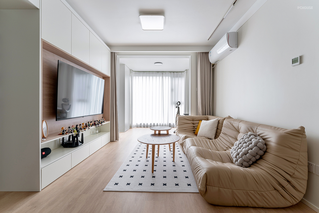 浅木色地板与暖白墙面构筑清新基底,原木茶几与几何纹地毯搭配,加上阳光透过纱帘倾泻,在简约秩序中流淌温润松弛的生活诗意。