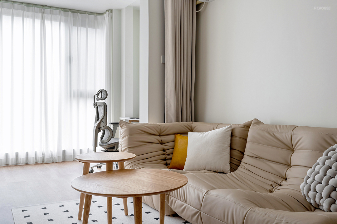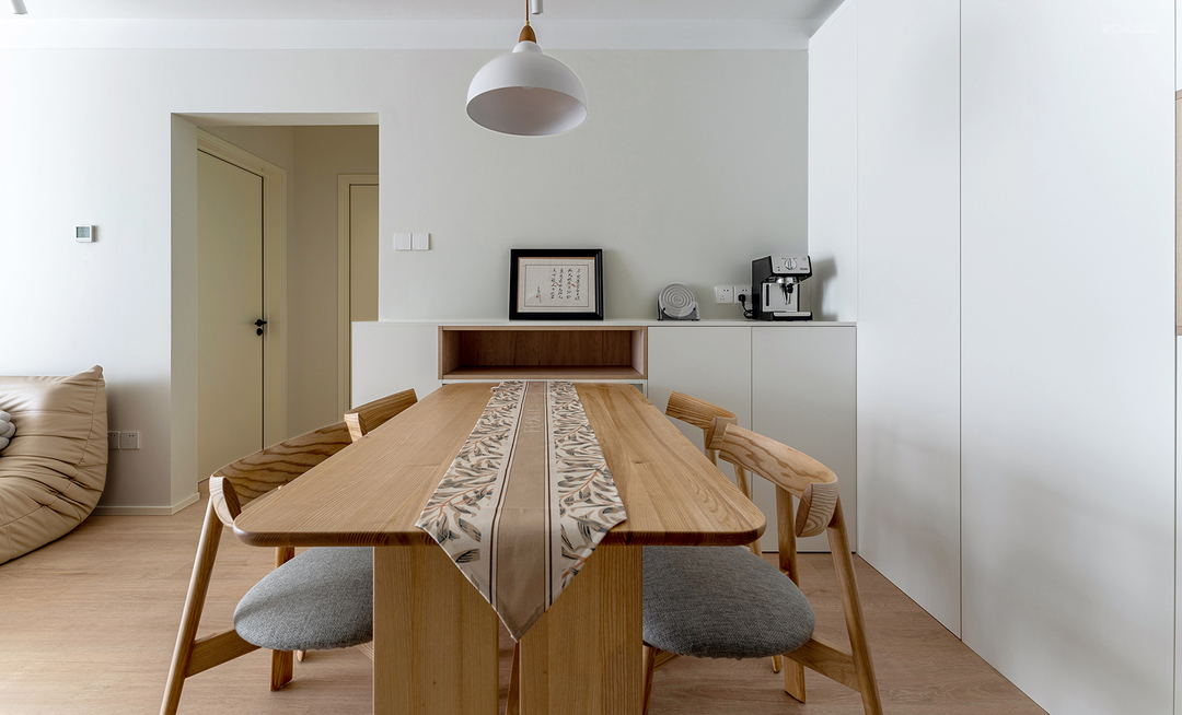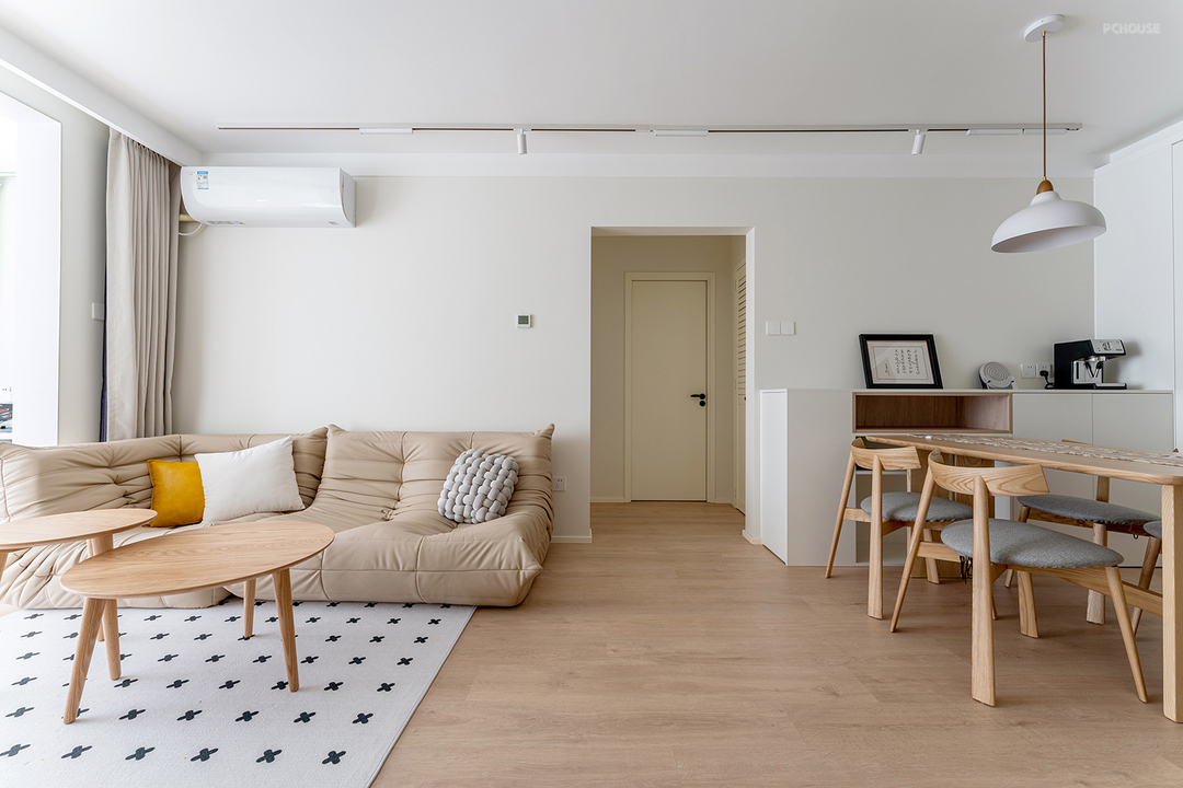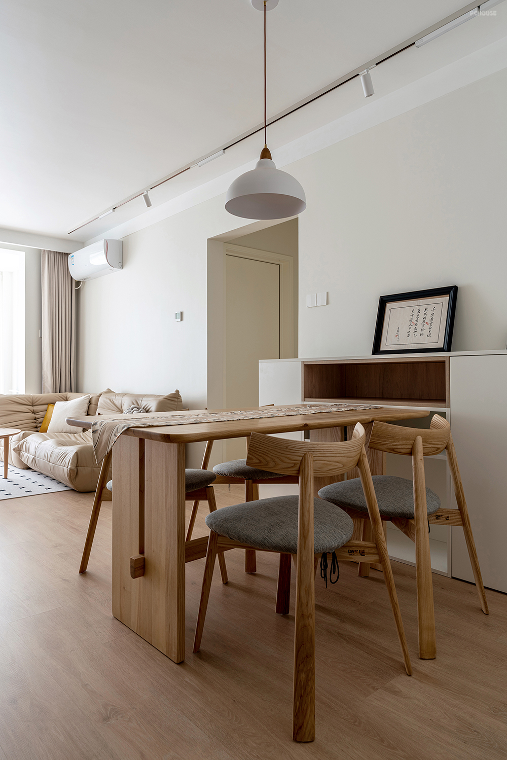 浅木地板与米色布艺沙发搭配,奠定了温润的空间基底。原木餐桌椅延续简约线条,让空间变得更有秩序。