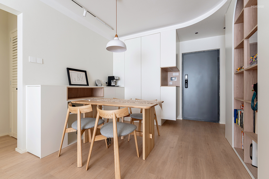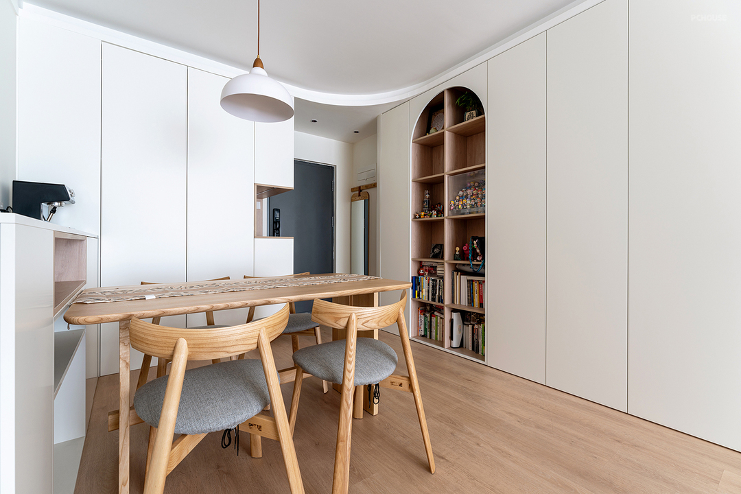 长度1.4米的餐桌与餐边柜组合,满足餐厅的小件物品摆放。右面通顶展架整合书籍与藏品陈列,弧形书架与吊顶相呼应。吊灯暖光漫射在白墙与原木之间,串联起用餐与阅读场景。