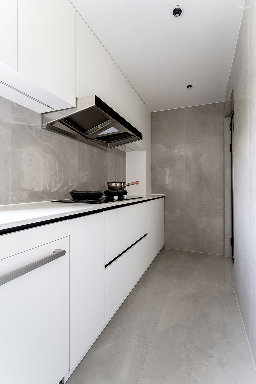 整体厨房干净明亮,总长4.9米的厨柜满足厨房所有收纳和使用。通铺的灰调瓷砖搭配简洁的白色橱柜,经典耐看还易打理。顶部无主灯设计漫射柔光,让紧凑布局中保有烹饪的舒适度。