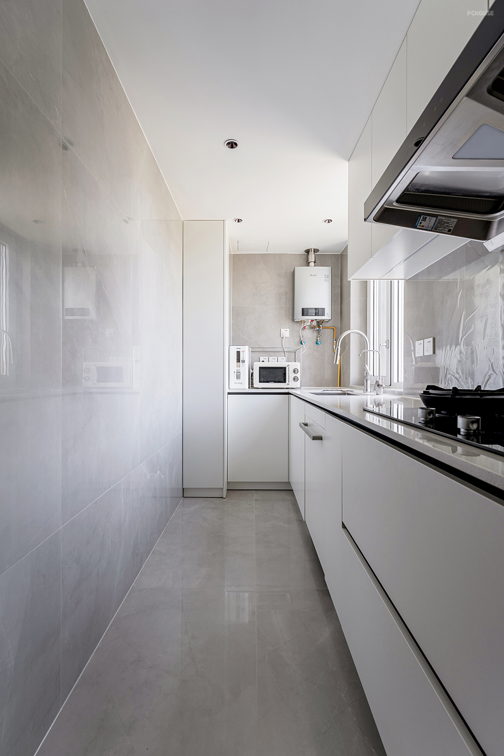 灰调的瓷砖易擦洗,并且与台面一体衔接。底柜中整合了洗碗机等电器的安放,将抽油烟机嵌入吊柜效果整齐干净。
