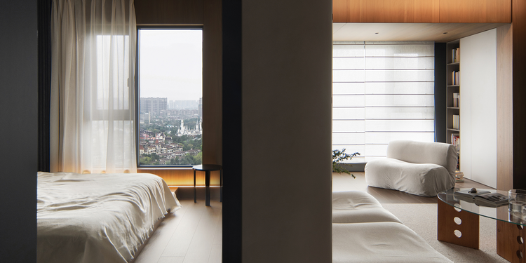 本案主卧的设计也是别具一格,和客厅可以完全开放,只用移门做为隔断。独居生活实在太惬意了,不必勉强社交,不用追赶时间,这样的时光才是真正的"充电时刻"。这样的卧室真的可以待一整天不出门。